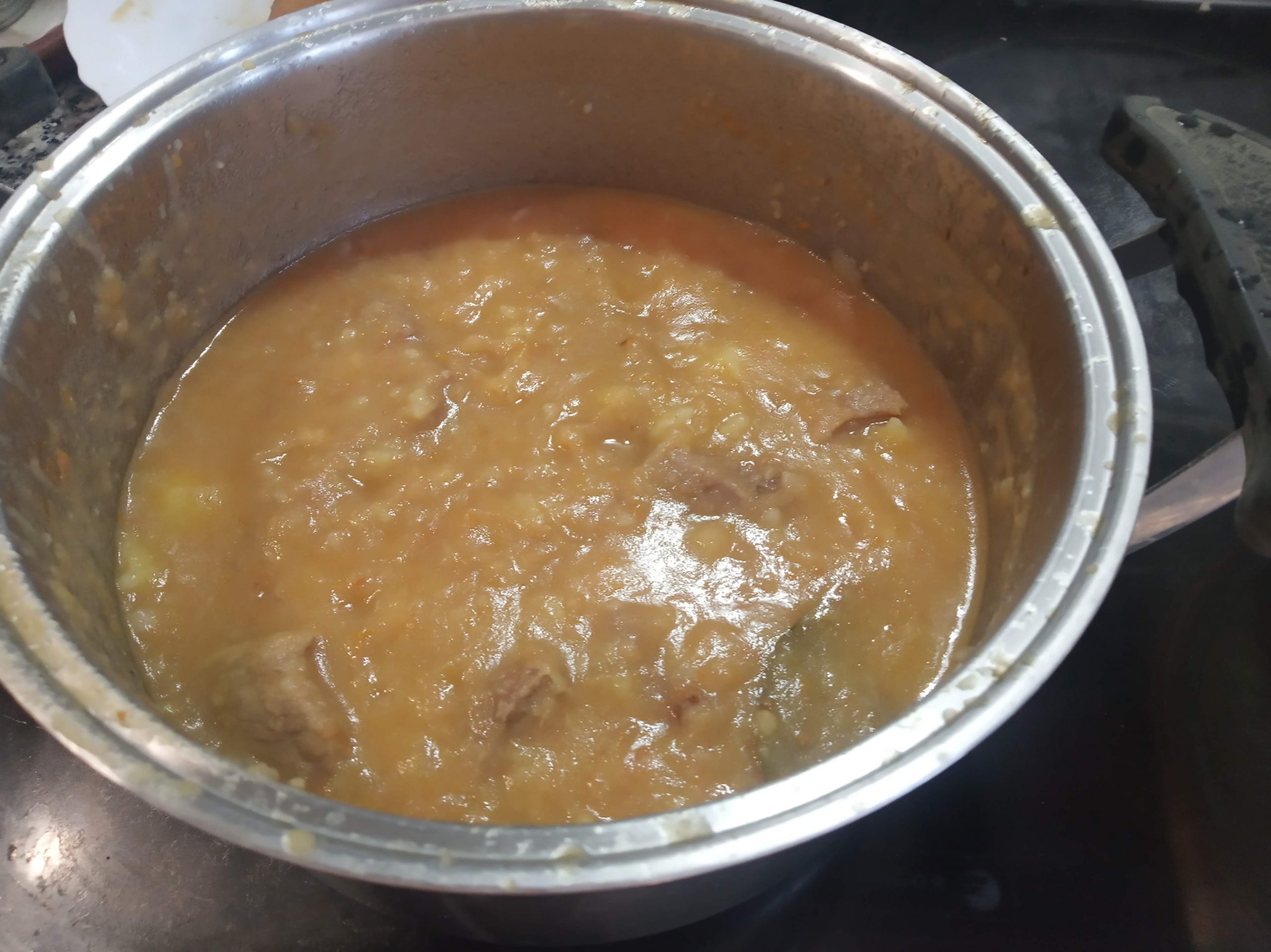 Mientras pelamos y cortamos las patatas en tacos, pasado ese tiempo, se le añade a la carne y la pastilla de caldo, mezclar y si hace falta echar más agua.