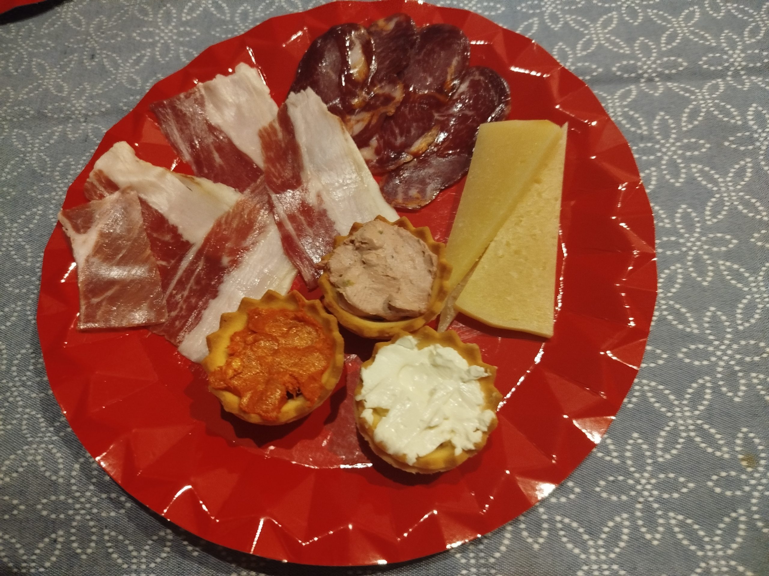 Plato individual de surtido ibérico: Jamón, caña de lomo, queso y tartaletas variadas y de gambas blanca.