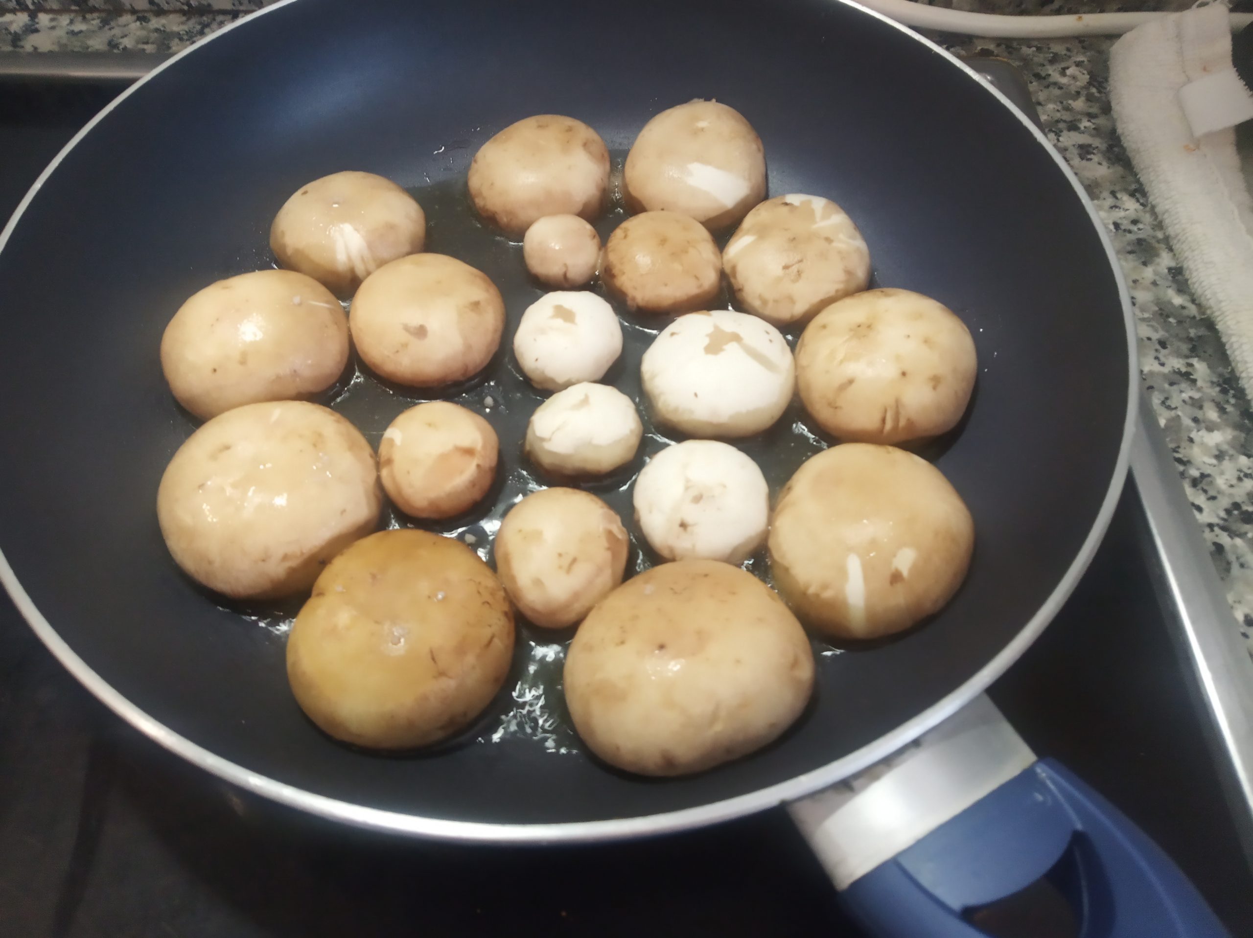 En una sarten, echar un poco de aceite, y colocar los champiñones para abajo.