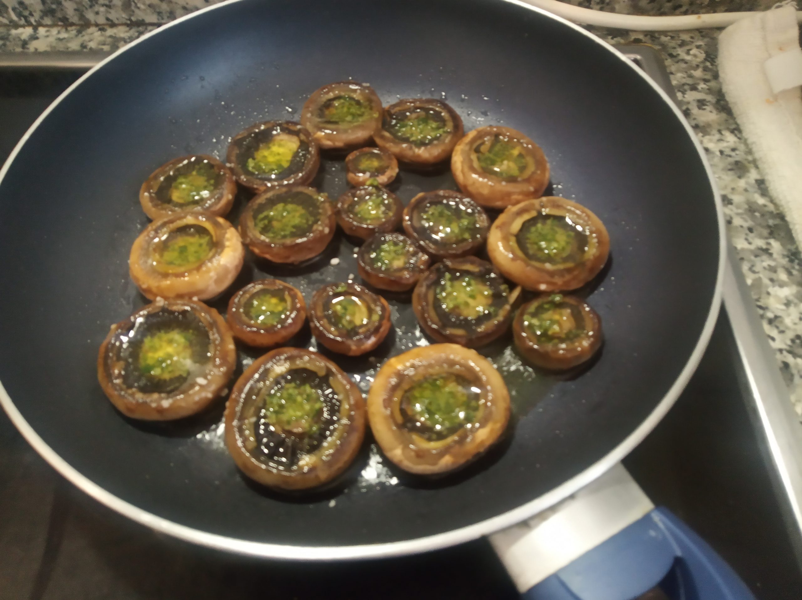 Cuando estén hecho, dar la vuelta, y echar el aliño en el centro de cada champiñón, con un poco de sal gorda, dejar cocer unos minutos y servir.