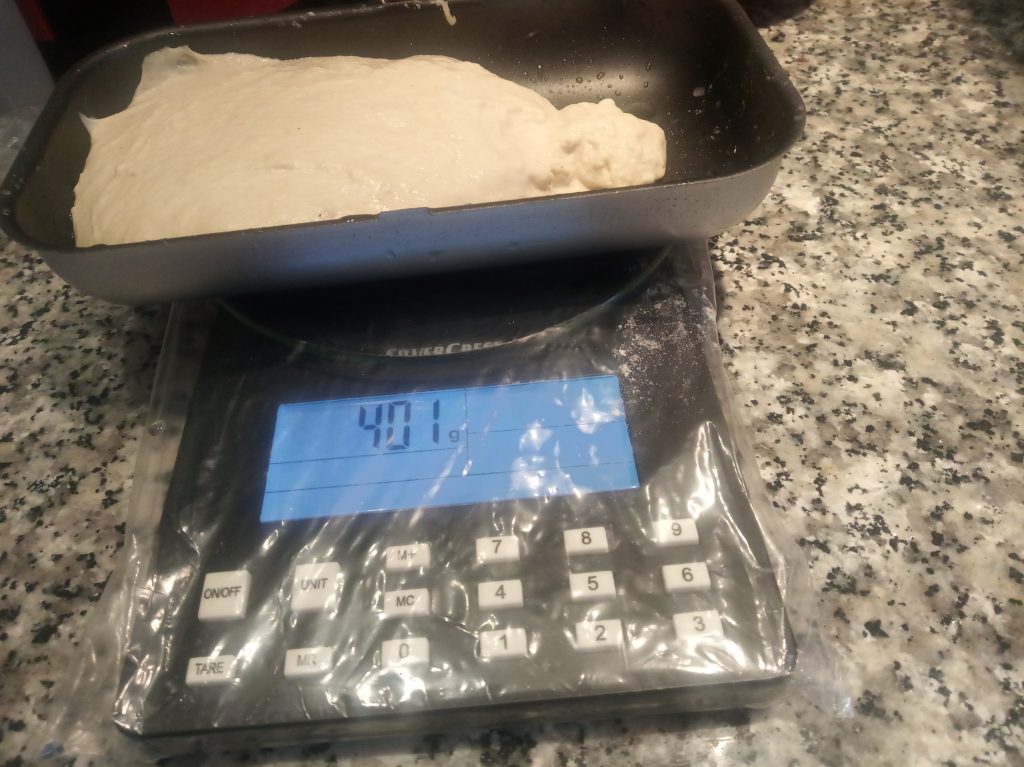 Sacar el cestillo grande, en los dos moldes de chapata, echar un poco de aceite y extender con un pincel. Repartir la masa, si tienes puedes pesarlo, para que sea la misma cantidad, puedes nivelar la masa, con las manos húmedas en agua.