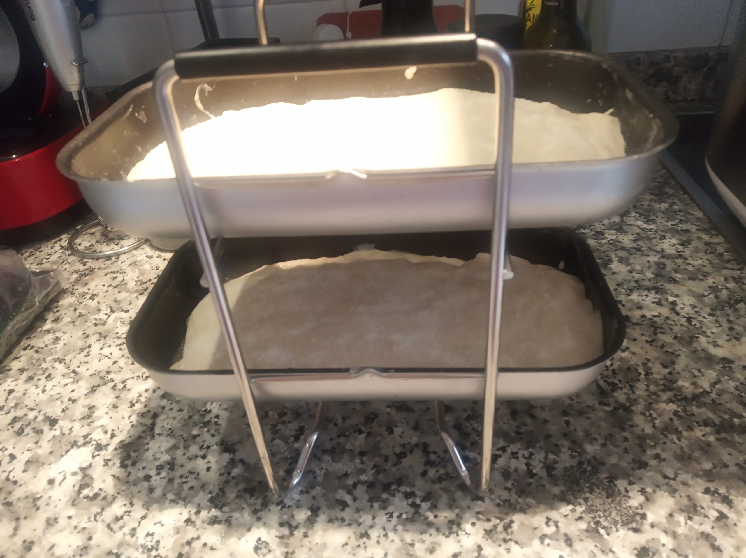 Sacar el cestillo grande, en los dos moldes de chapata, echar un poco de aceite y extender con un pincel. Repartir la masa, si tienes puedes pesarlo, para que sea la misma cantidad, puedes nivelar la masa, con las manos húmedas en agua.