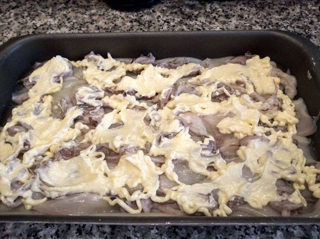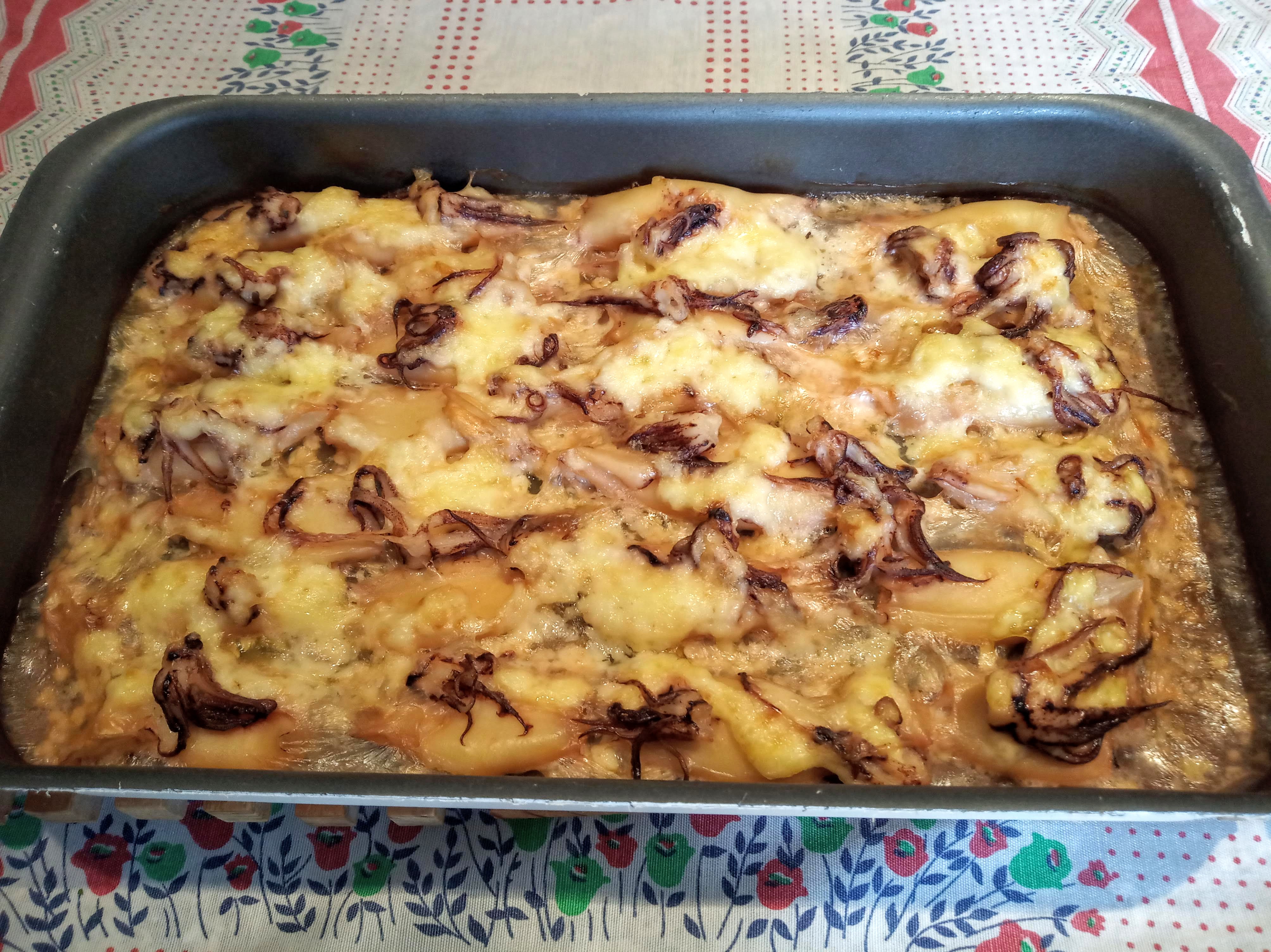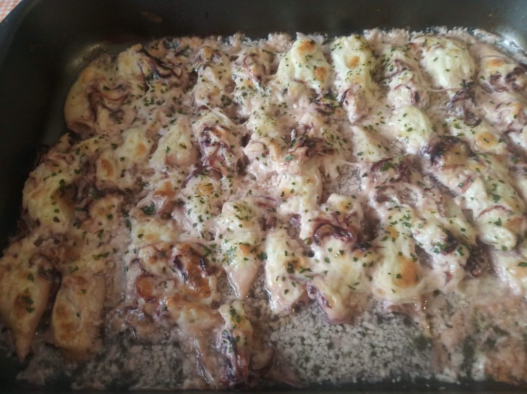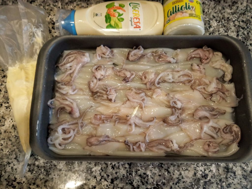 Repartir en una bandeja apta de horno, primero los calamaritos y encima los tentáculos.