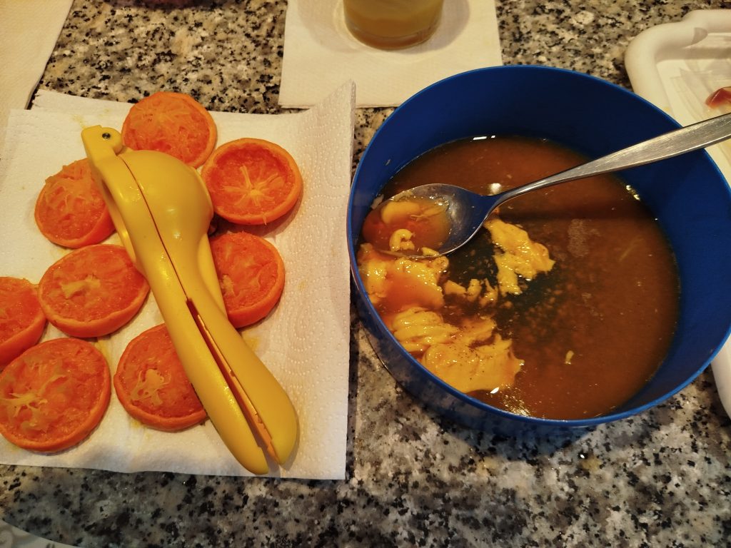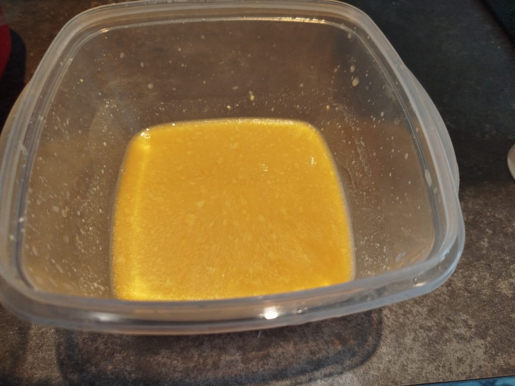 En un cuenco o táper, echar el zumo de las mandarinas y el resto del marinado, emulsionar todo, yo suelo hacerlo, con un batidor chico.