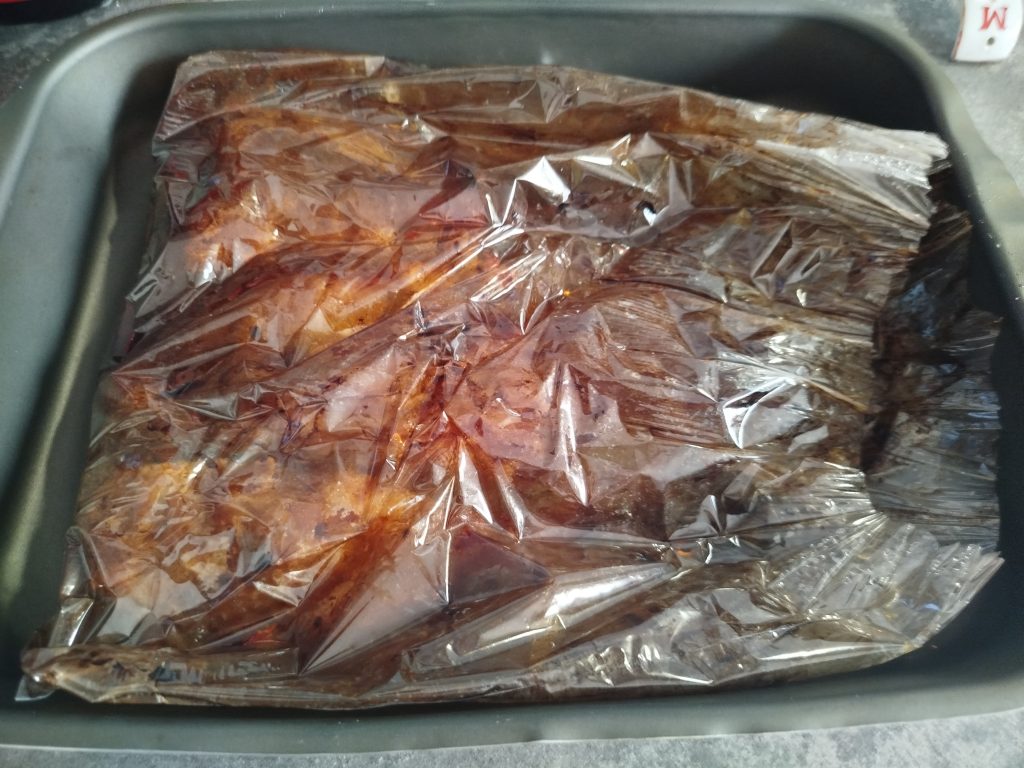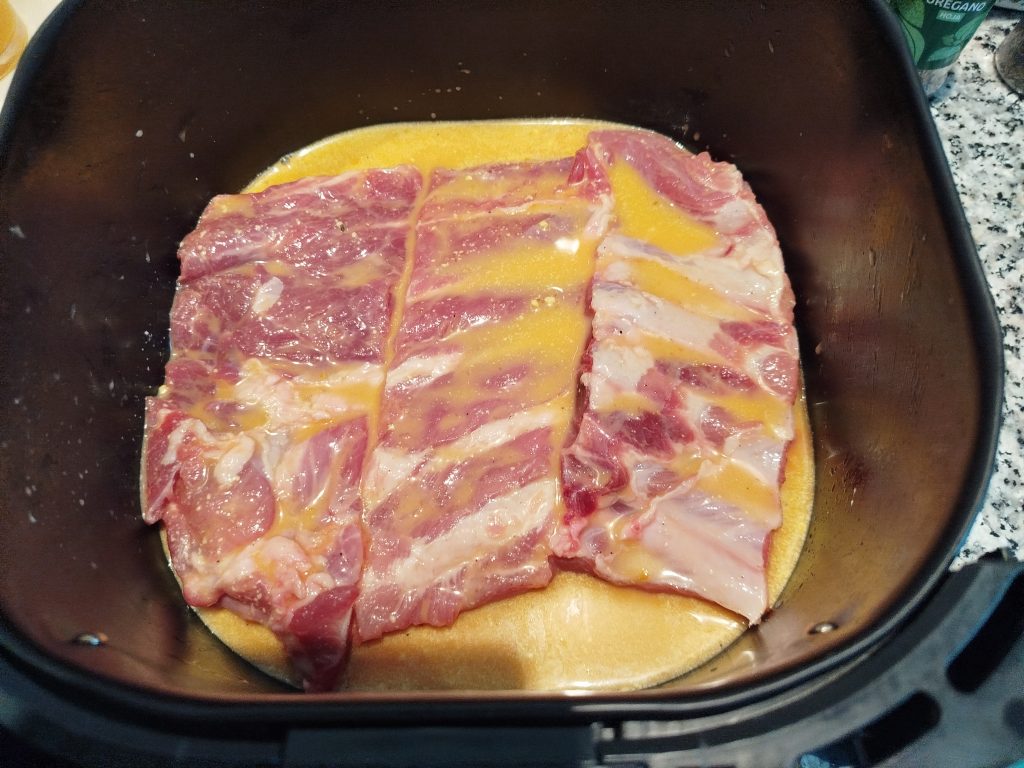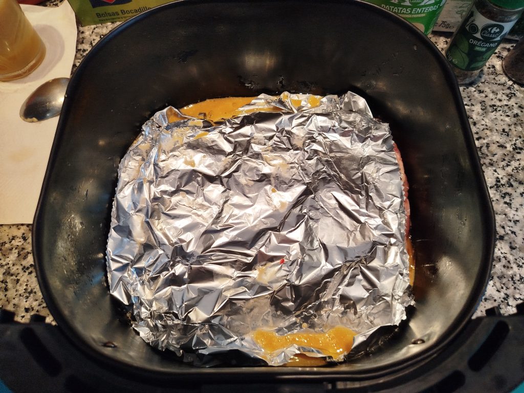 Directamente en el cestillo de la Freidora de aire, sin rejilla, ni nada, colocar el costillar, en mi caso lo corte en tres partes, y me cabía bien, le eche por encima el marinado y tapar con papel de aluminio, para que no se seque, ni se dore por ahora. Reservar el papel de aluminio, para reposar al final tapado.