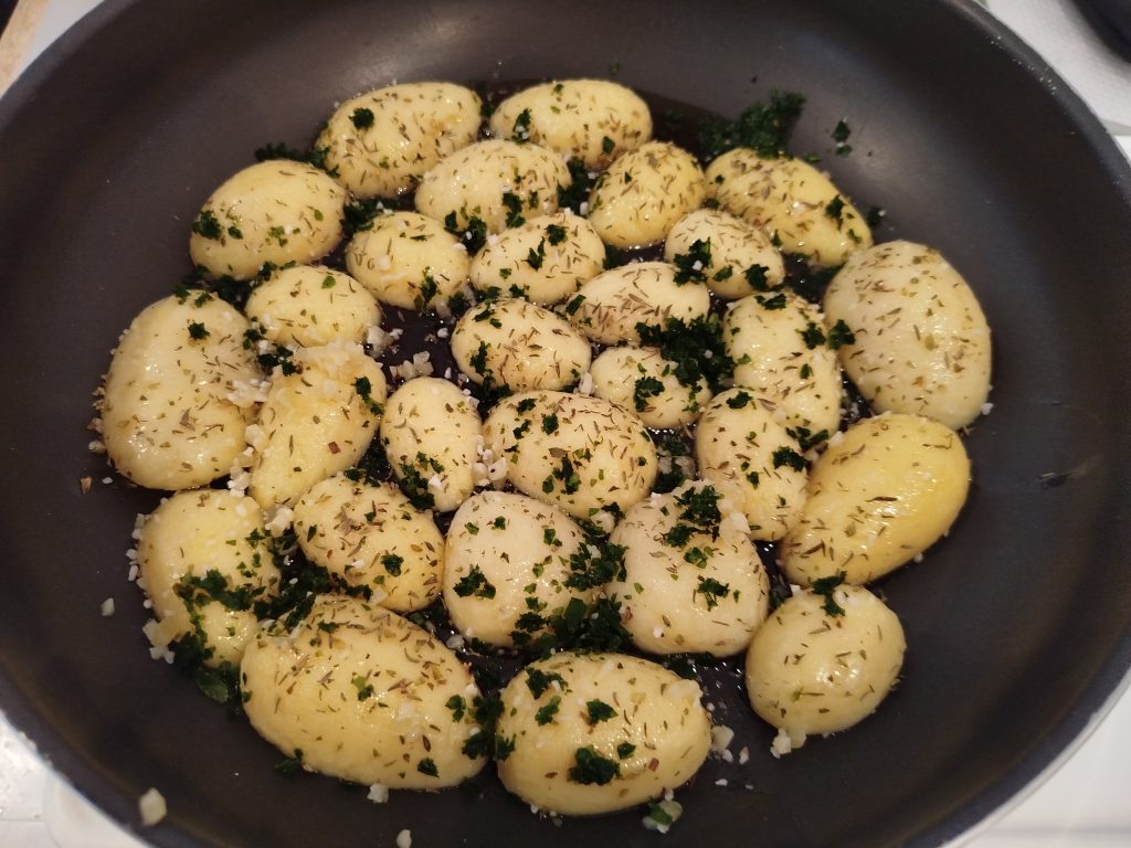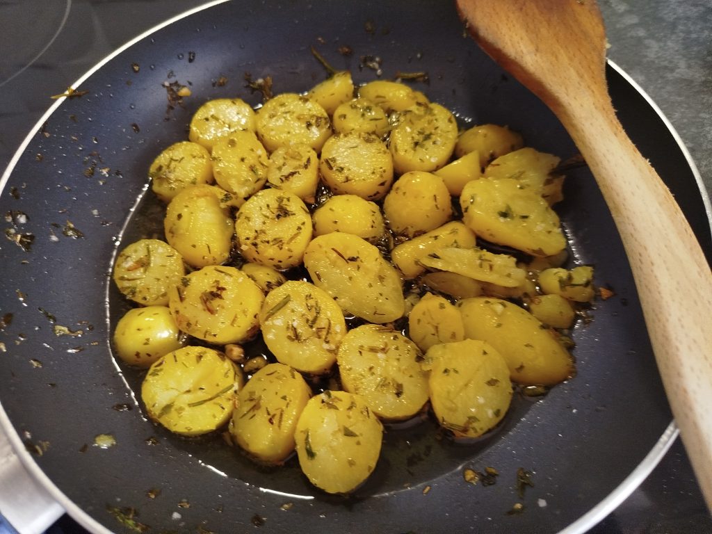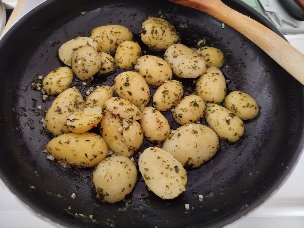 Yo tenía un bote de papas cocidas, los lave muy bien, en un escurridor, y las parti por la mitad a lo largo, las coloque en una sarten grande, con un poco de aceite de oliva, y el resto de ingredientes, mezclar todo muy bien y calentar y dorar un poco, para servirlas con el costillar.