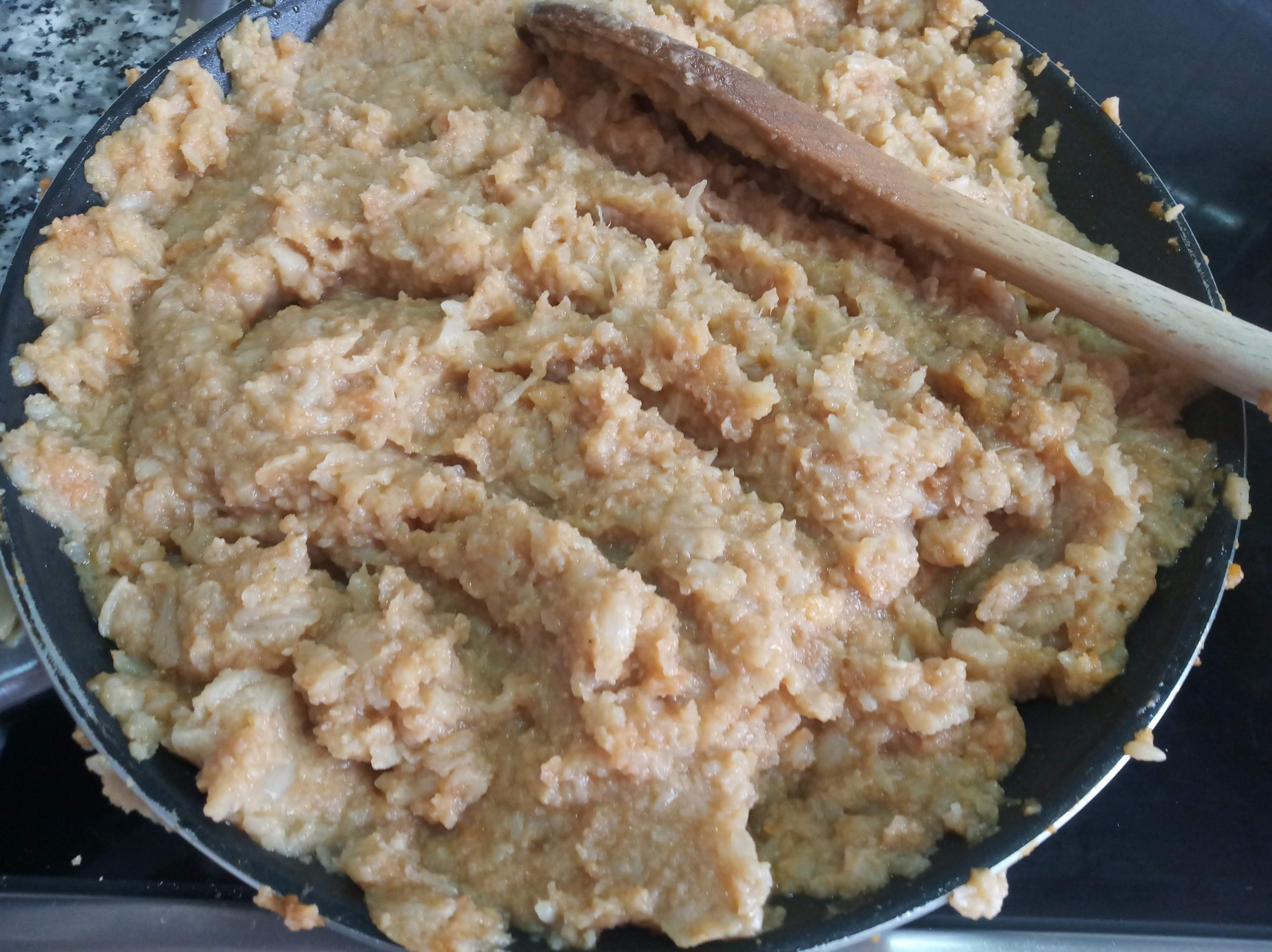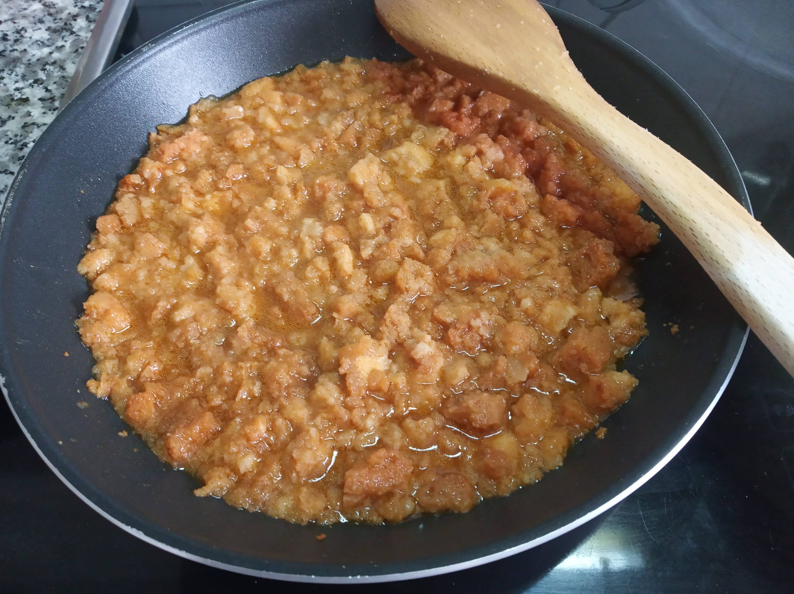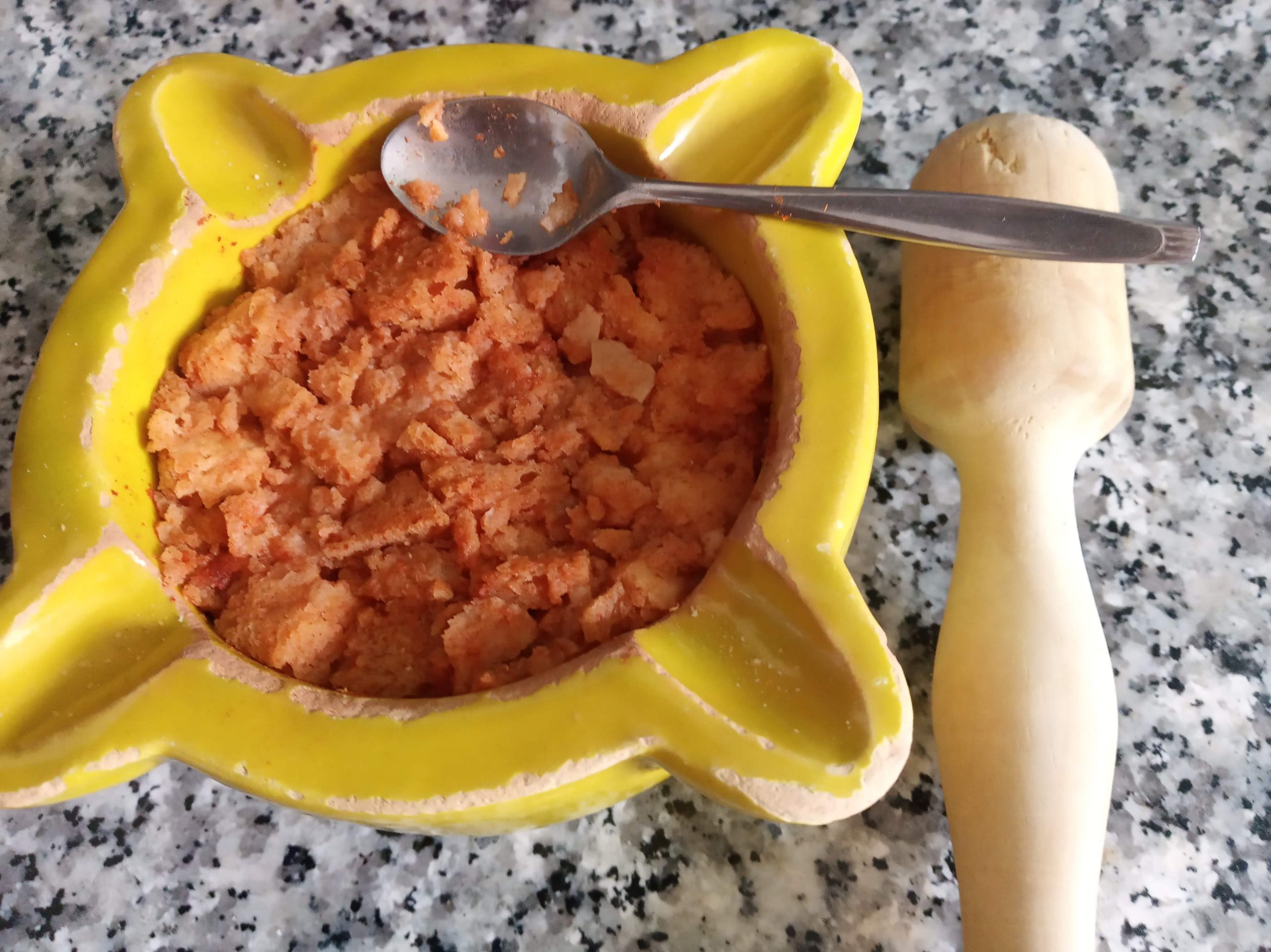 Añadir una cucharadita, tamaño de café, de sal, ajo molido, comino y pimentón dulce, cubrir con agua, remover muy bien y cuando este blando, pasar el mazo del mortero.