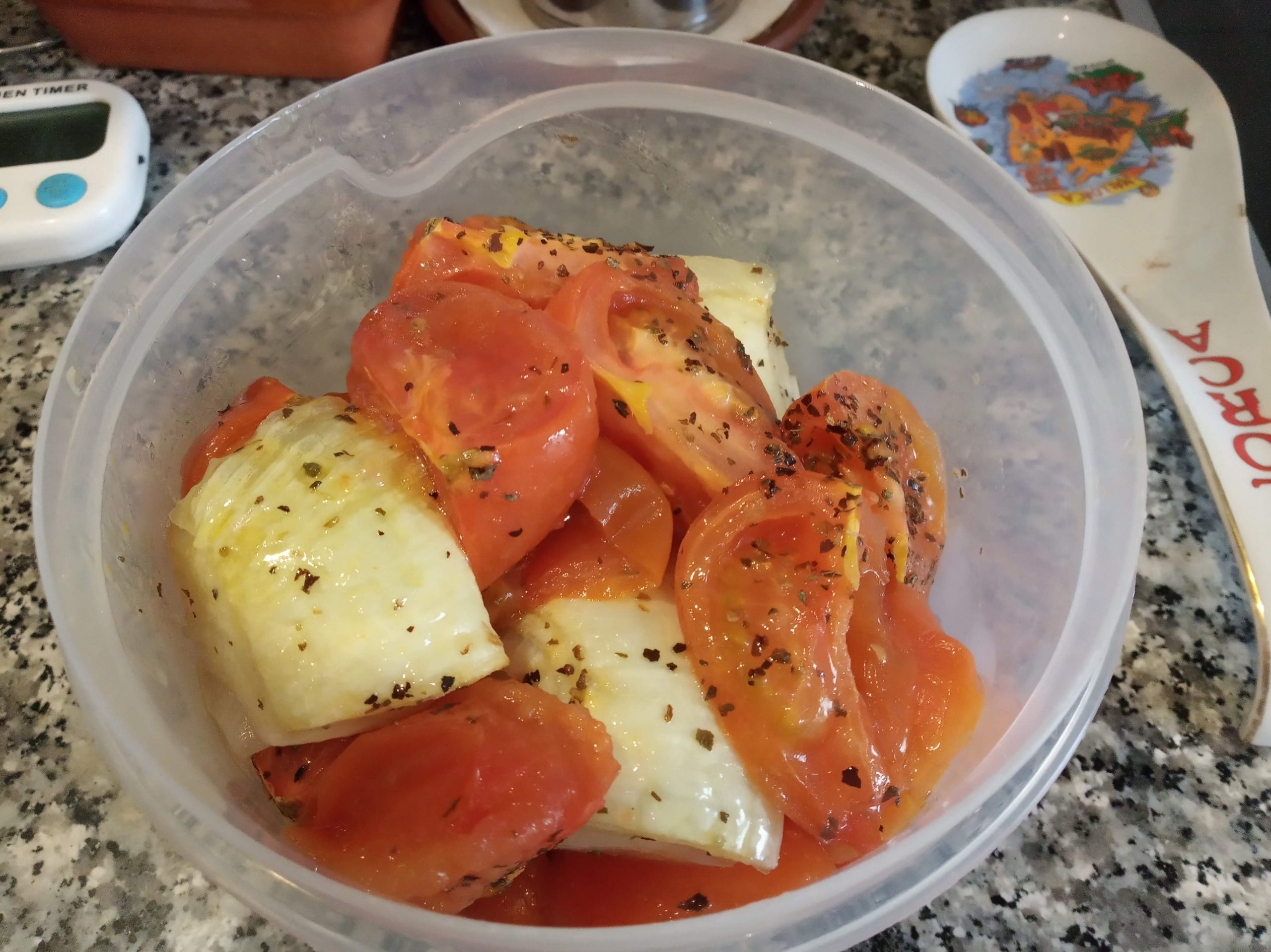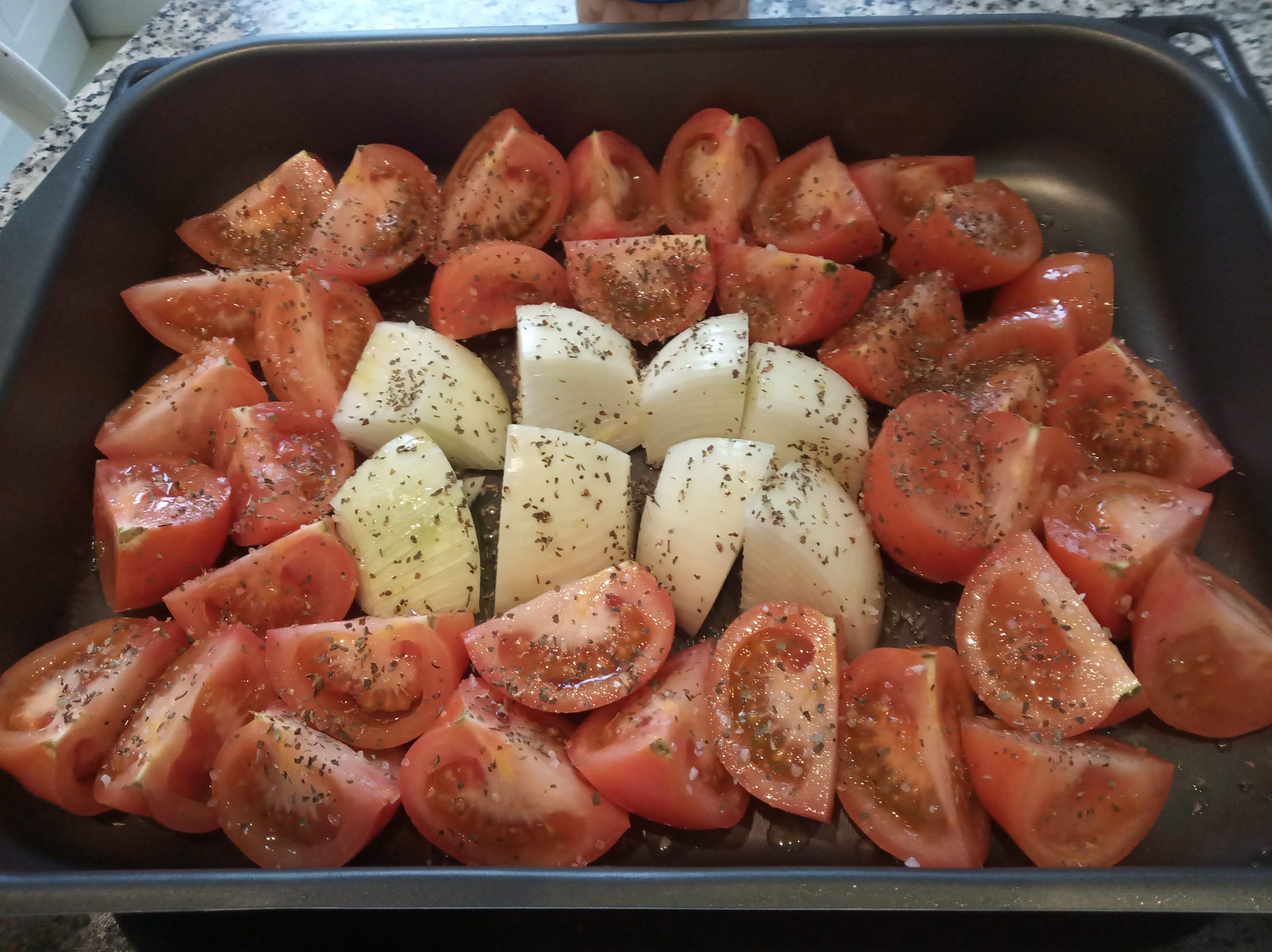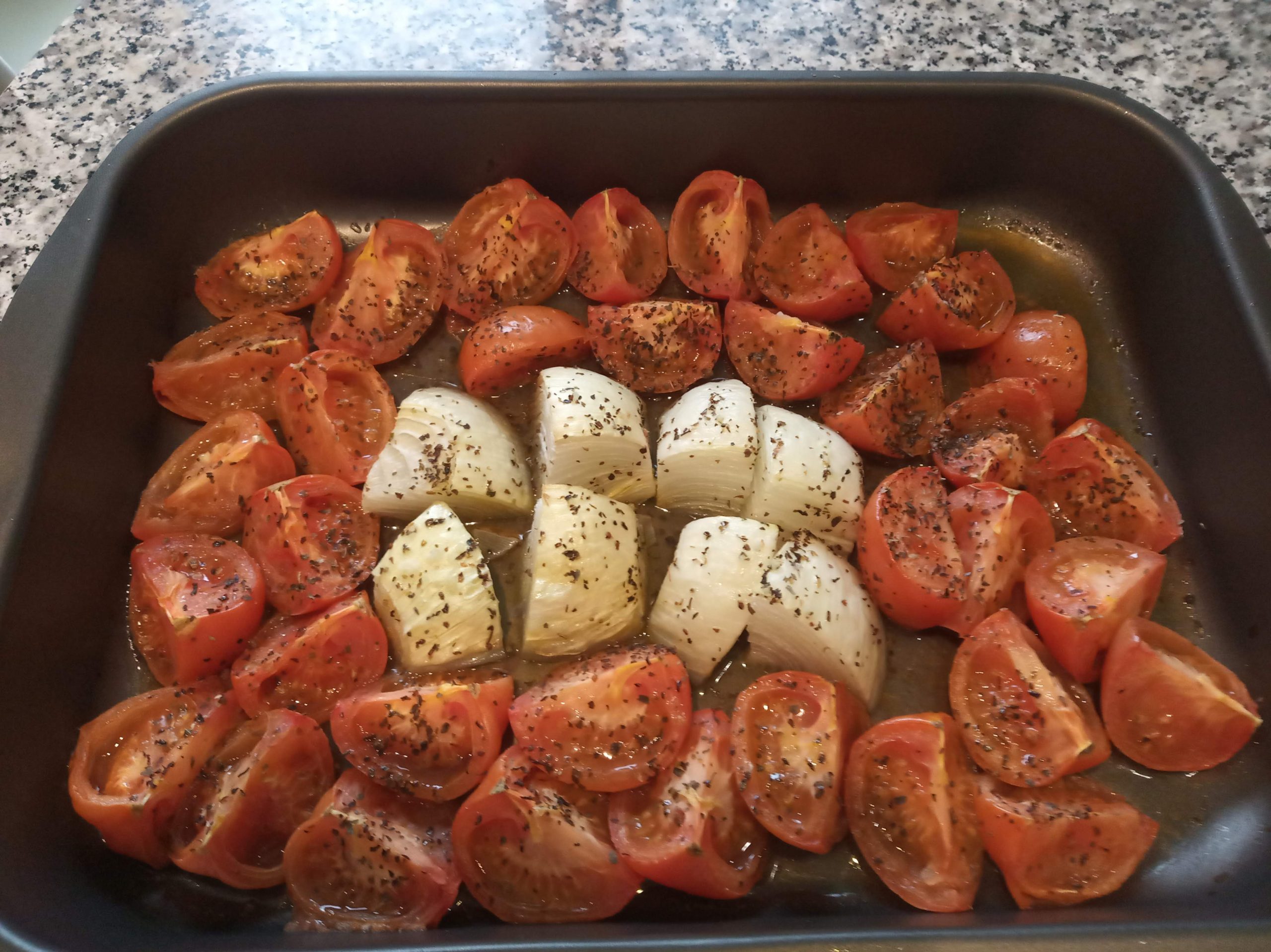En una bandeja grande apta para horno, colocamos los tomates y la cebolla troceada.