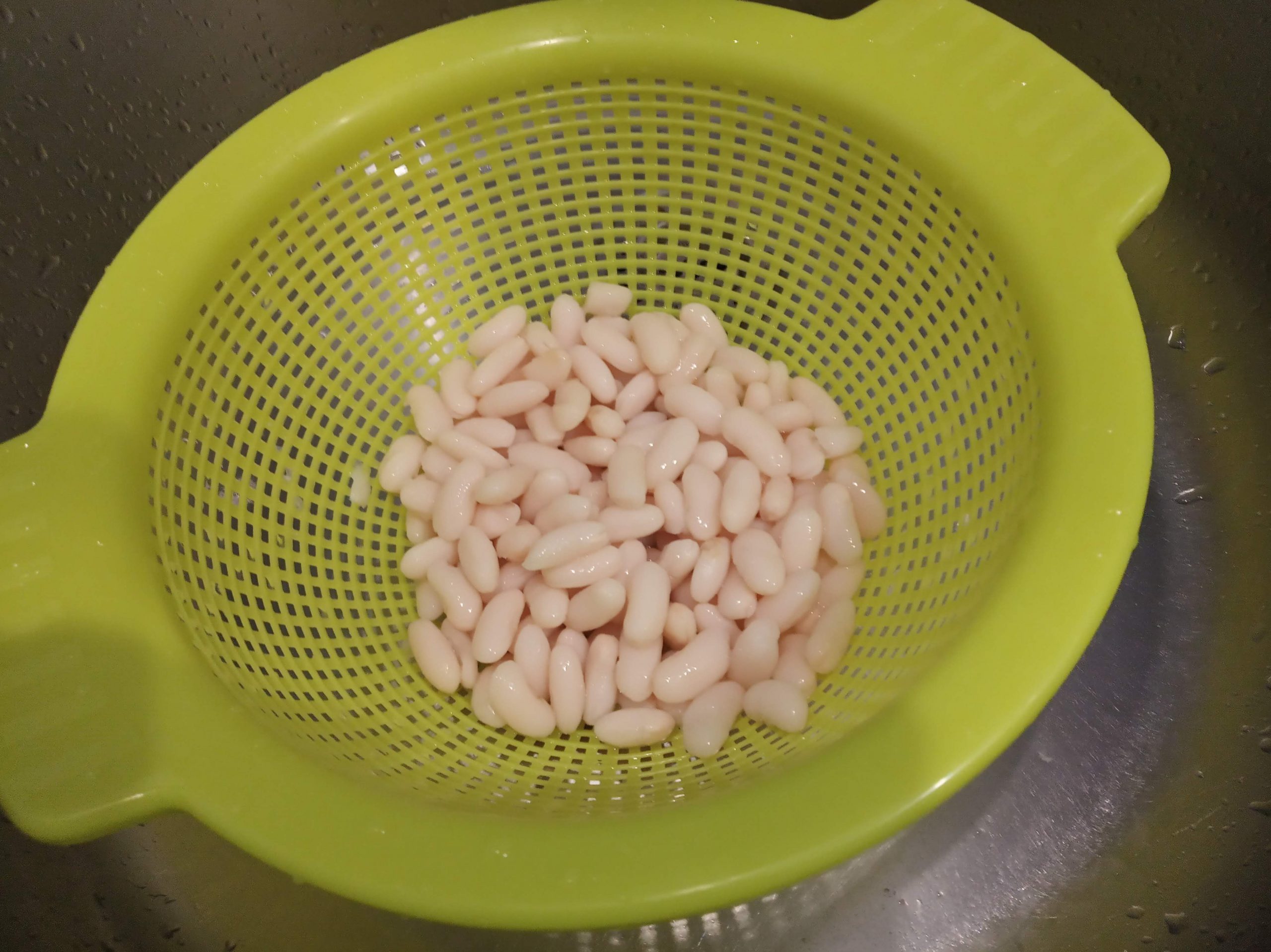 Echar las alubias blancas en un escurridor, y lavar bajo el grifo.