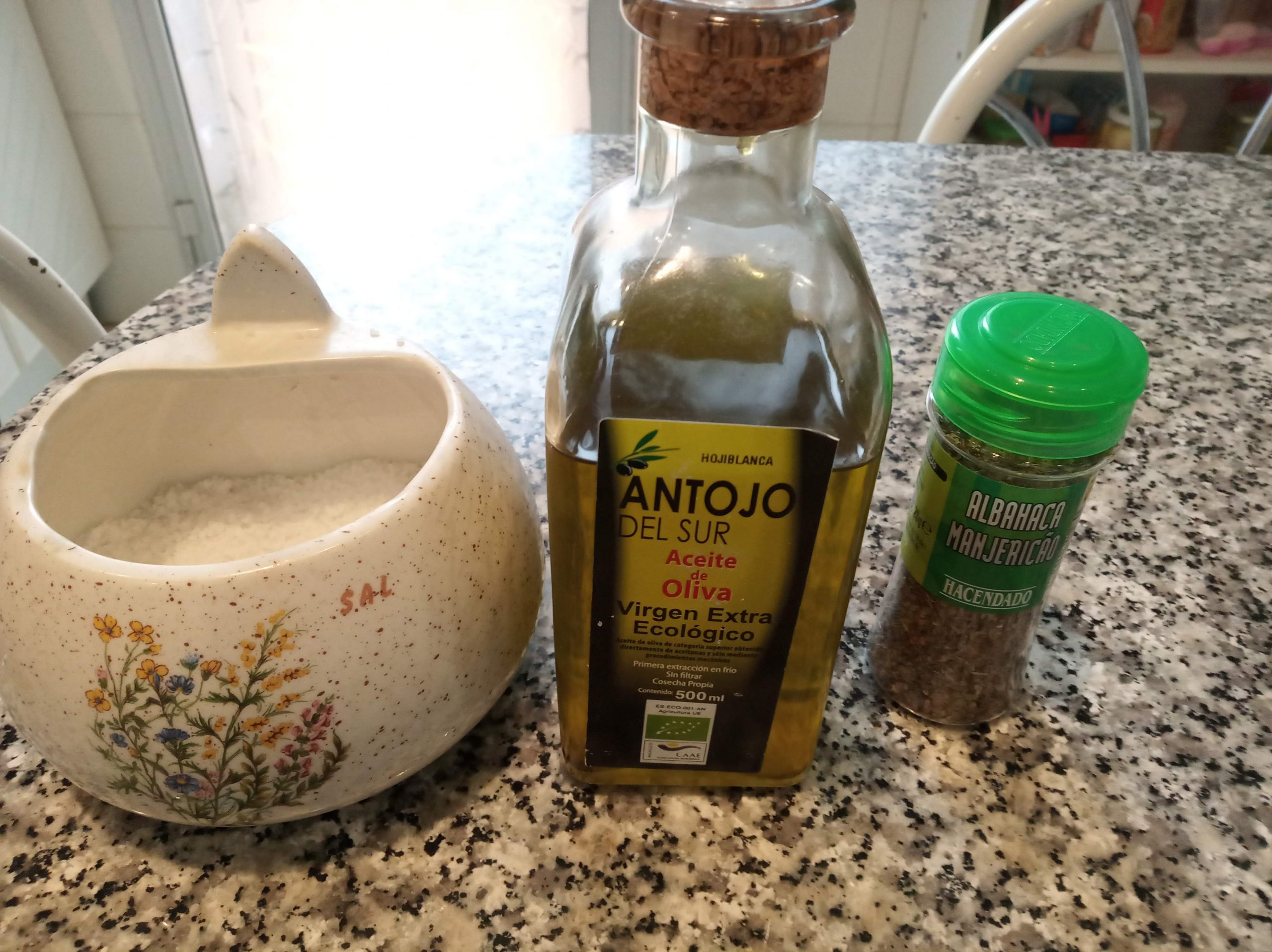Le echamos por encima un buen chorreón de aceite, sal y albahaca.
