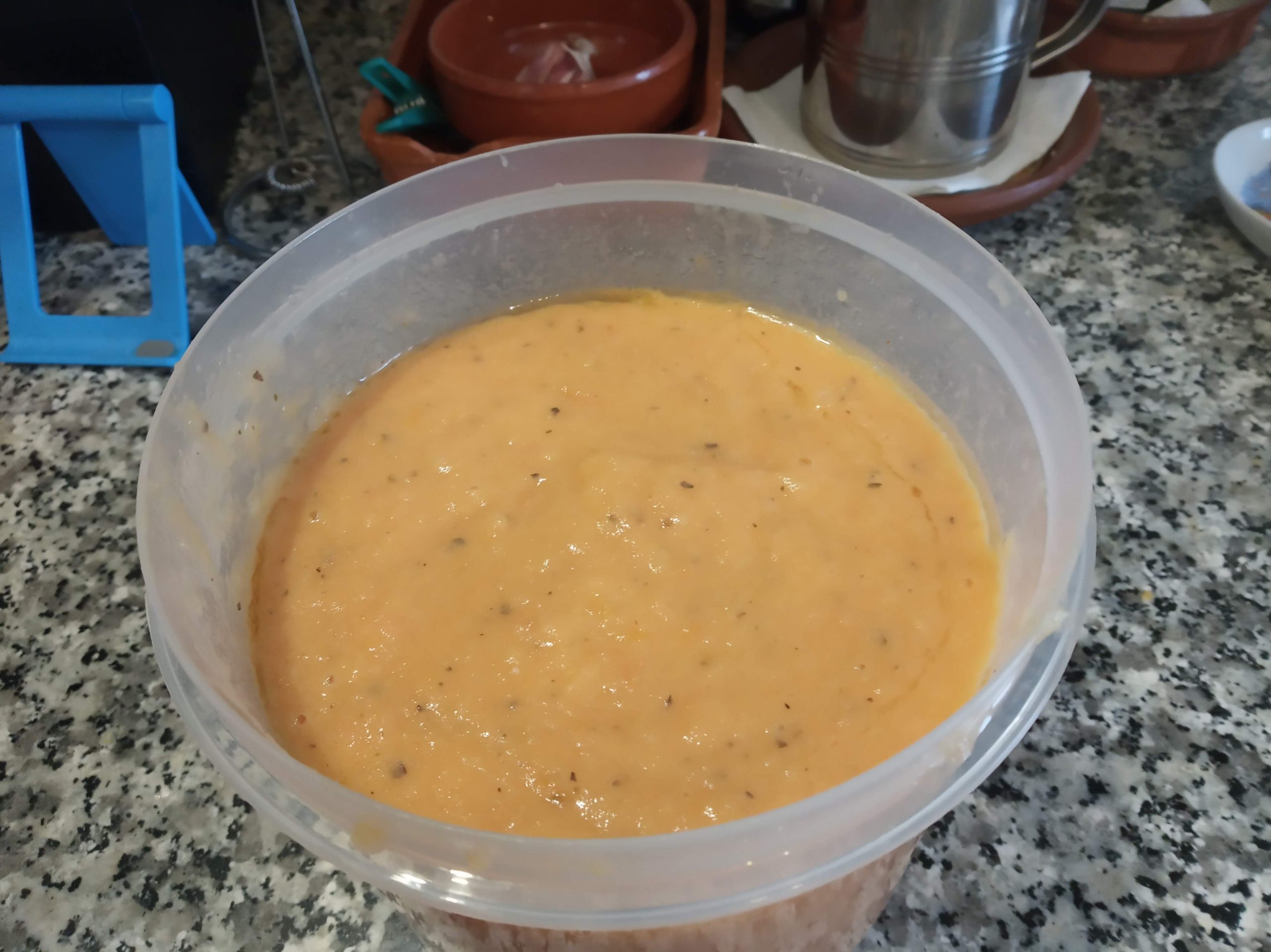 En un táper alto, echamos los ingredientes de la bandeja y su jugo.