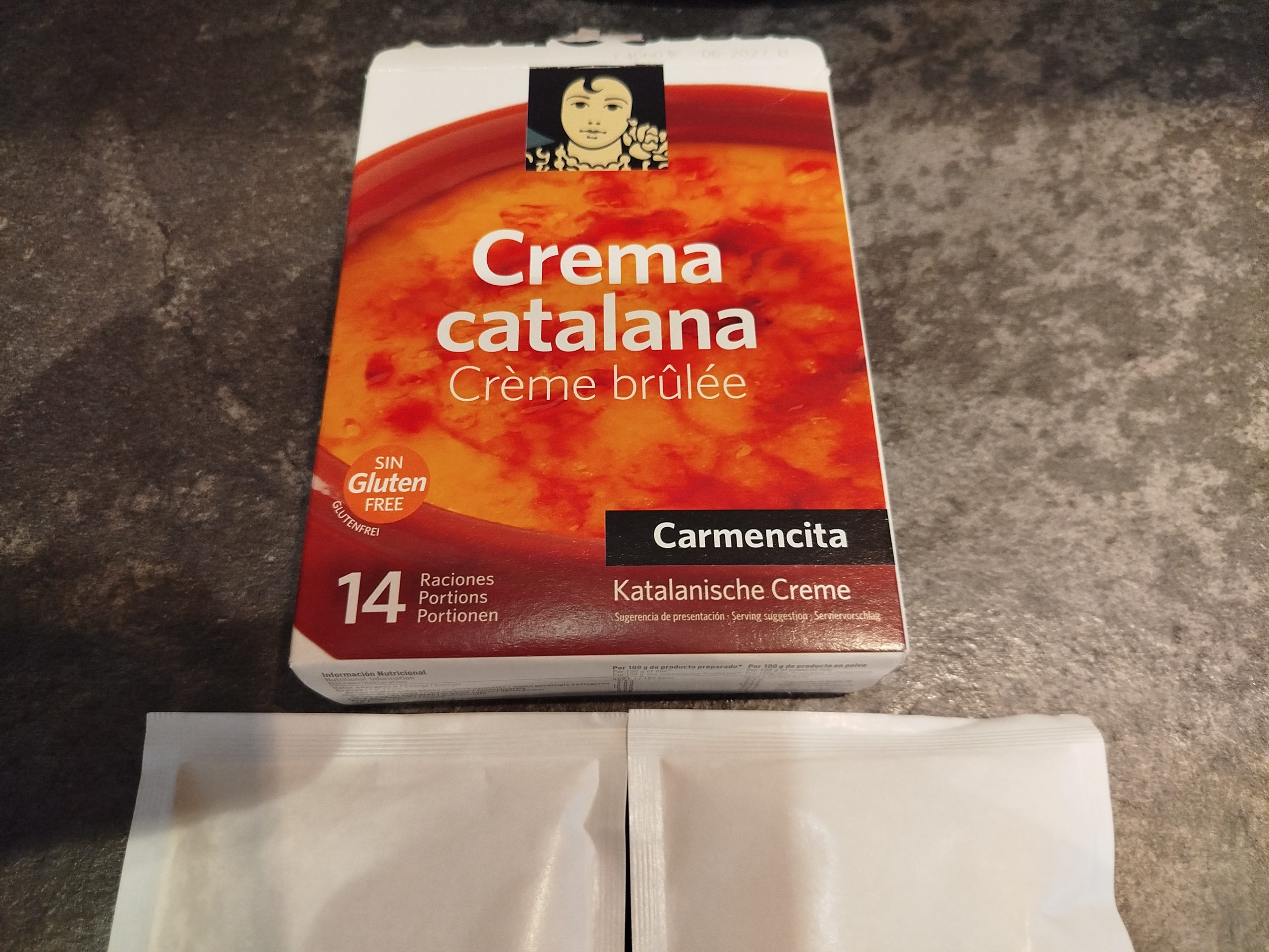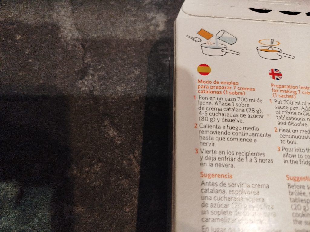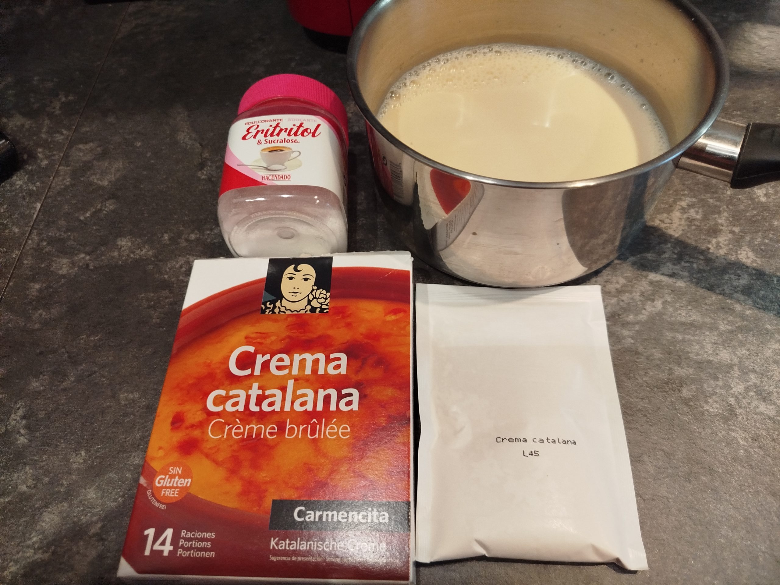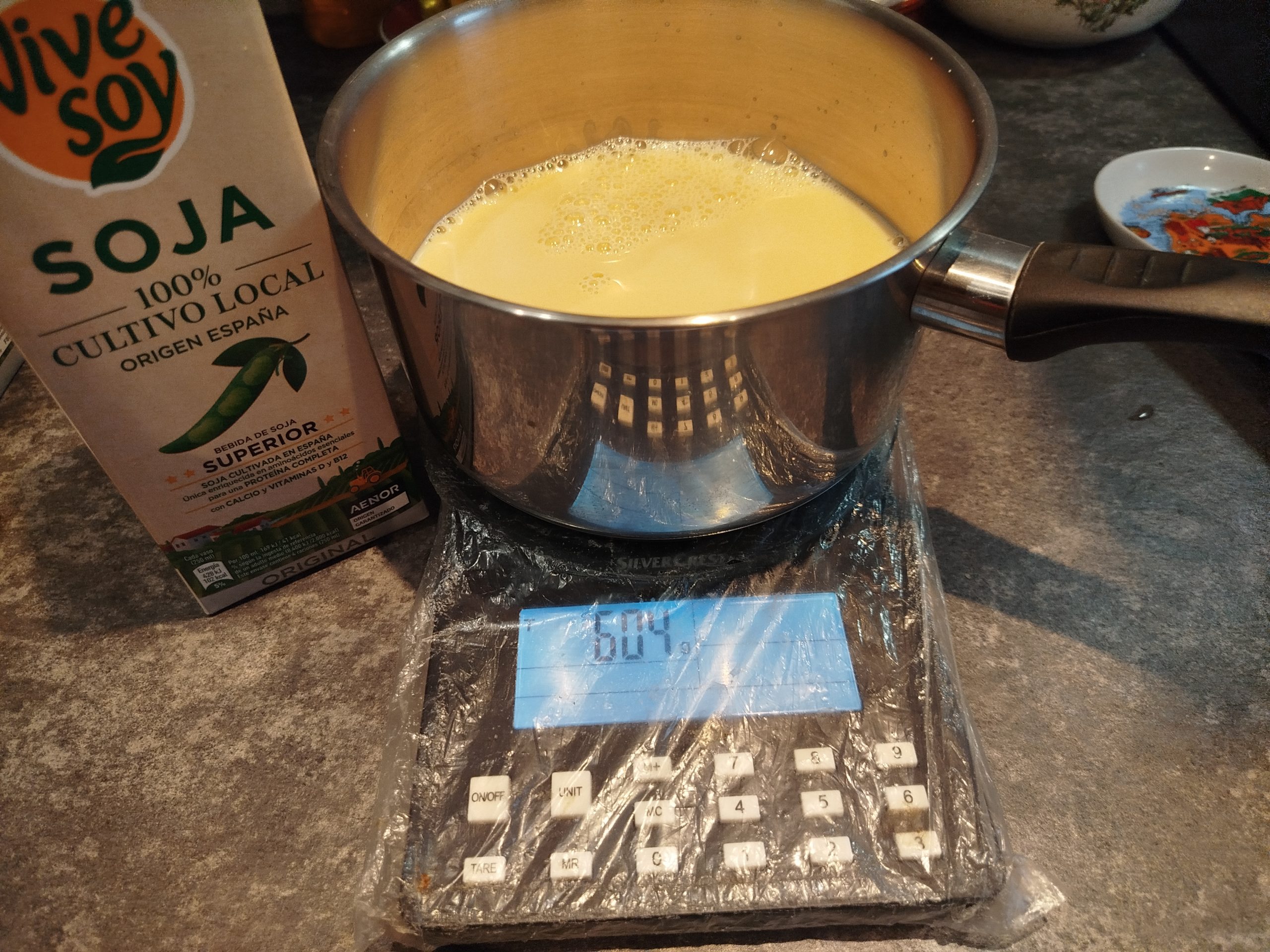 Echar en un cazo, la bebida de soja, y el sobre de Crema catalana, mezclar muy bien, y poner a calentar a fuego bajo.