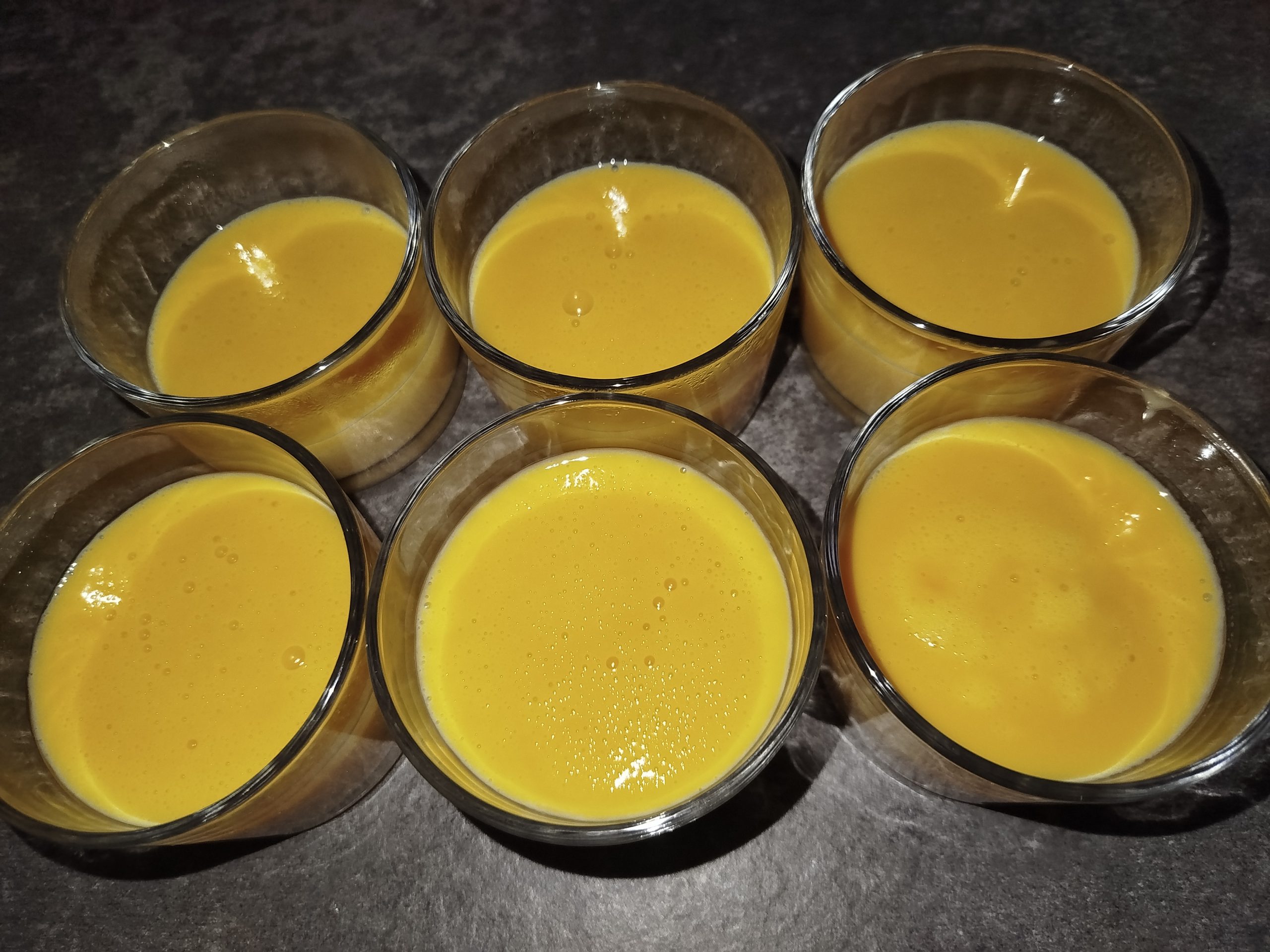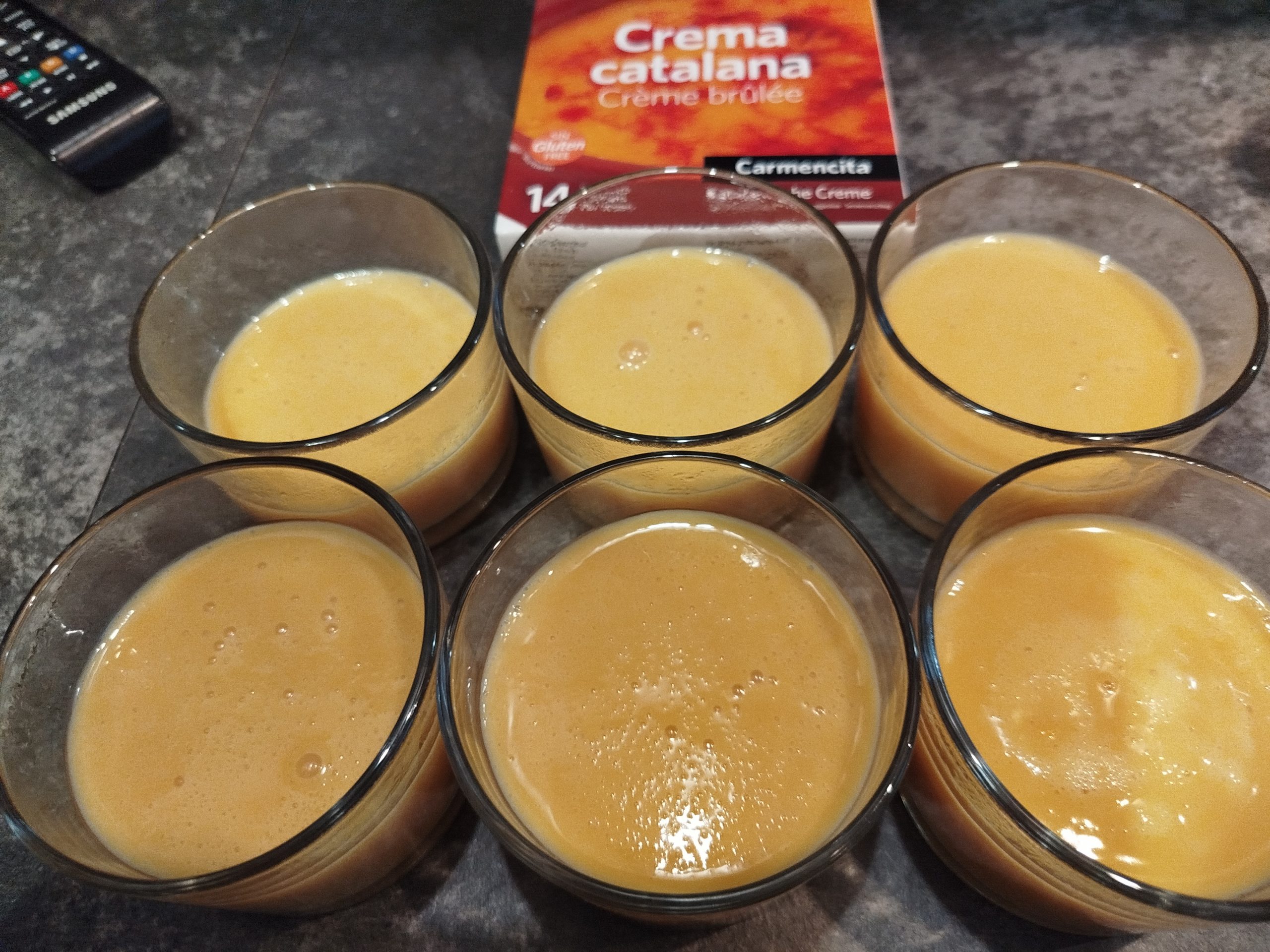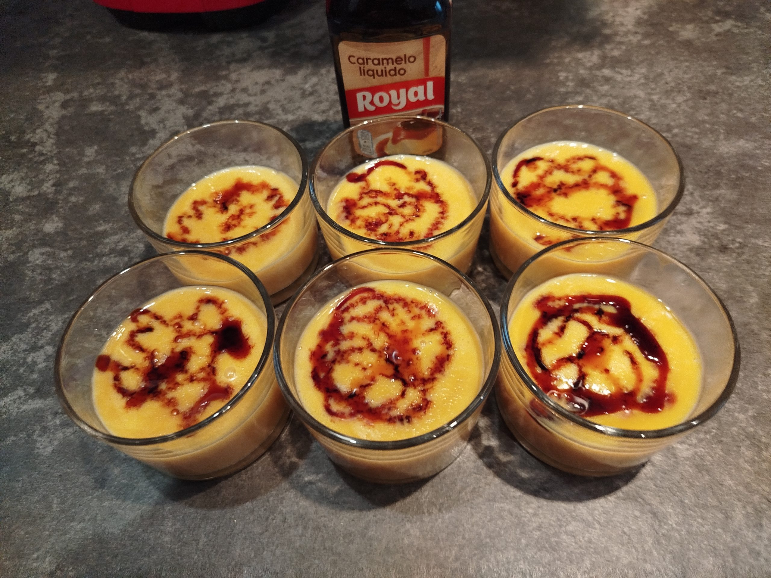 Repartir en seis vasos bajos, si tienes para quemar azúcar o Eritritol, se lo echas por encima, cuando este frío.