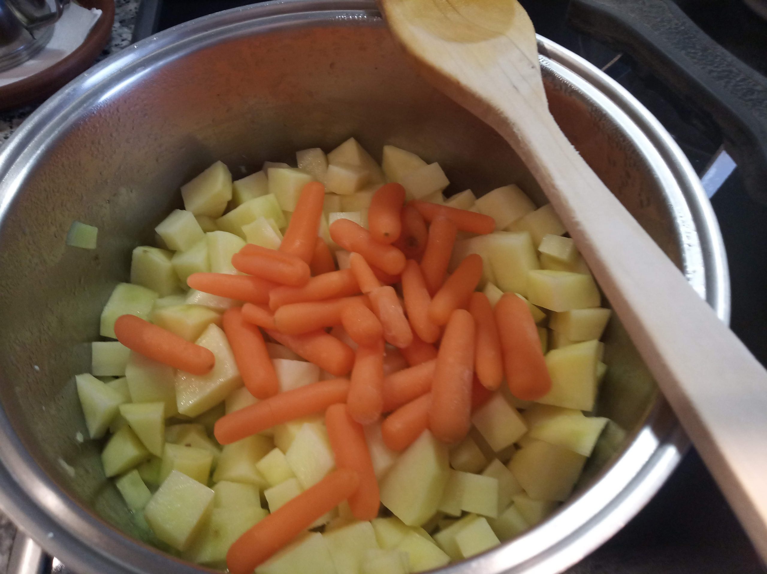 Poner una cazuela con el agua y las verduras y los cubitos de Maggi.