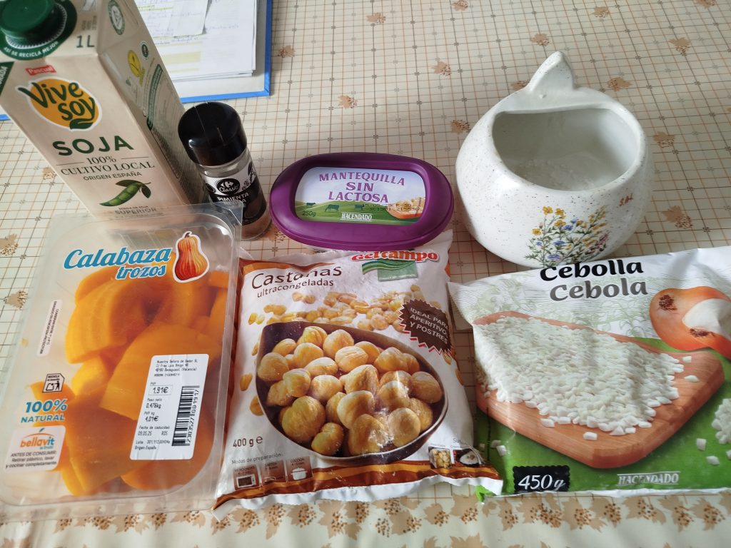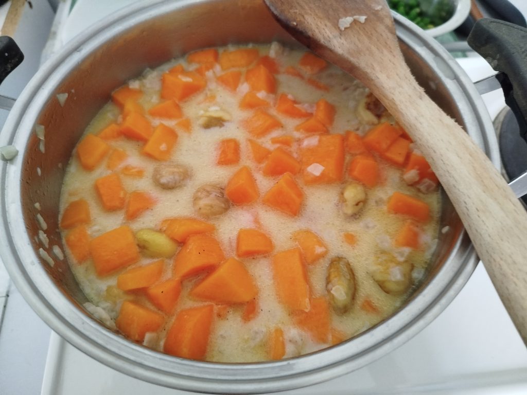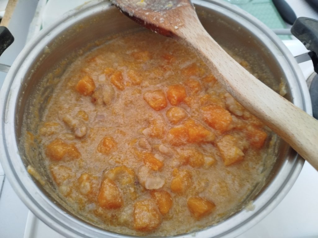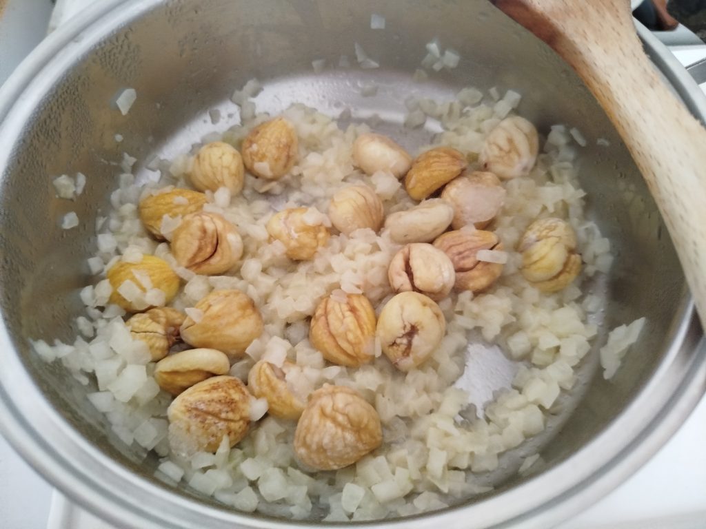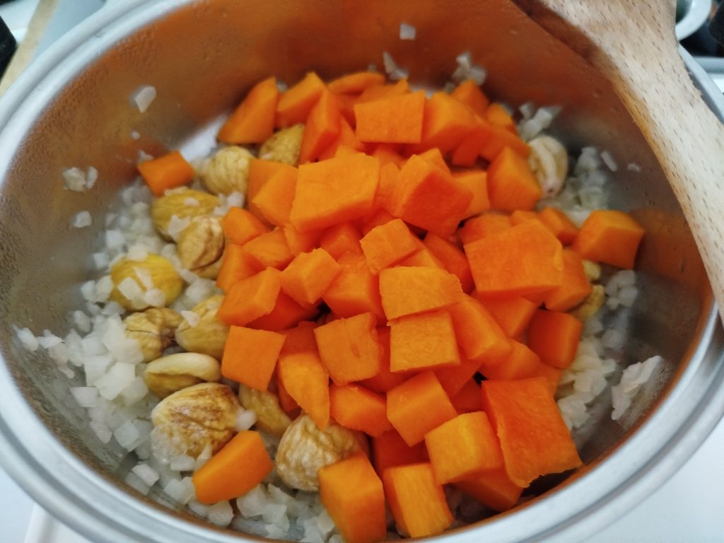 Cortar la calabaza en trozos no muy grandes, añadir las castañas y las calabaza, a la cebolla, mezclar todo y dejar unos minutos sofriendo.