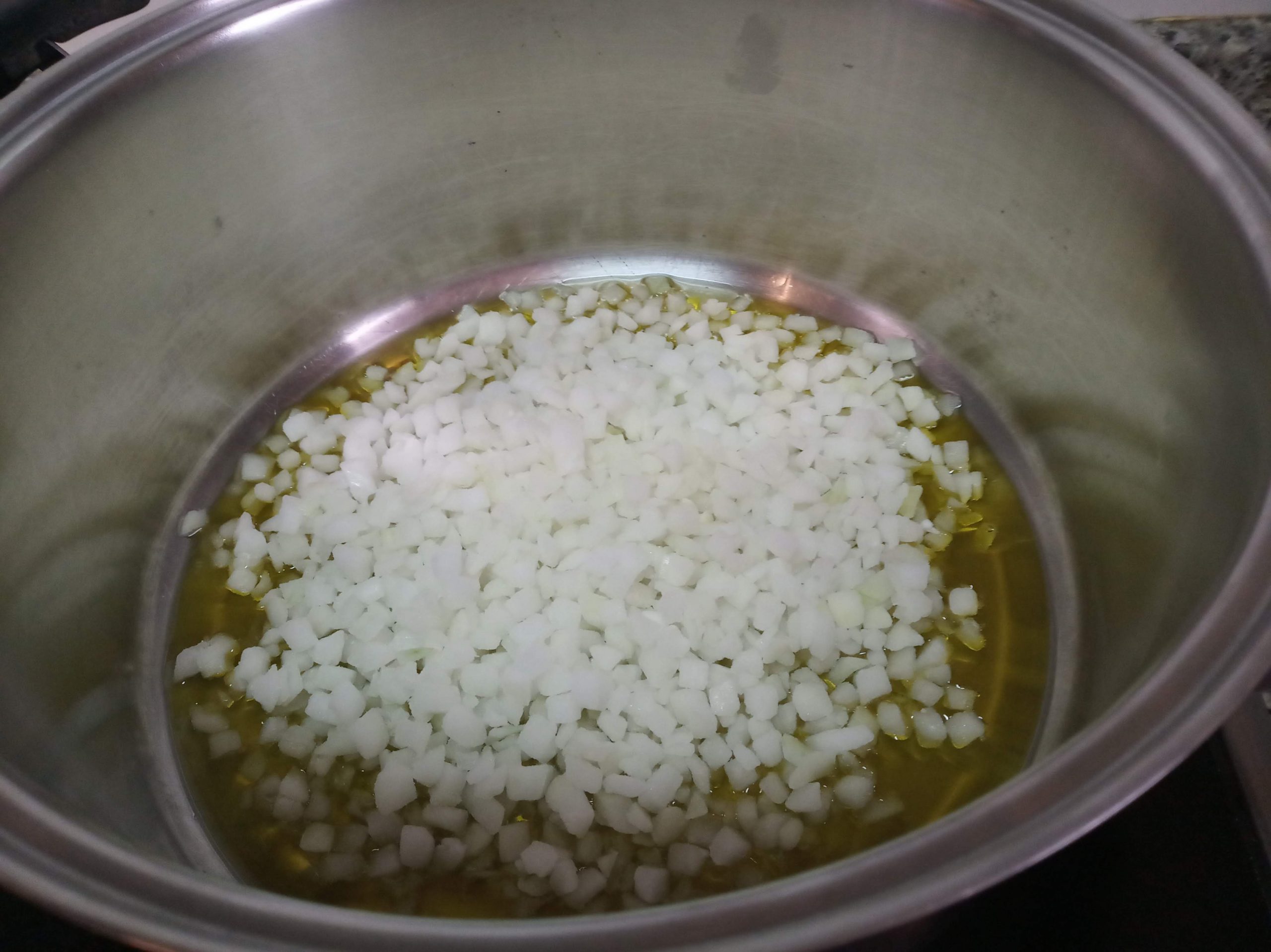 En una cacerola alta, echamos un poco de aceite y refreímos las cebollitas o cebolla, troceada con un poco de sal.