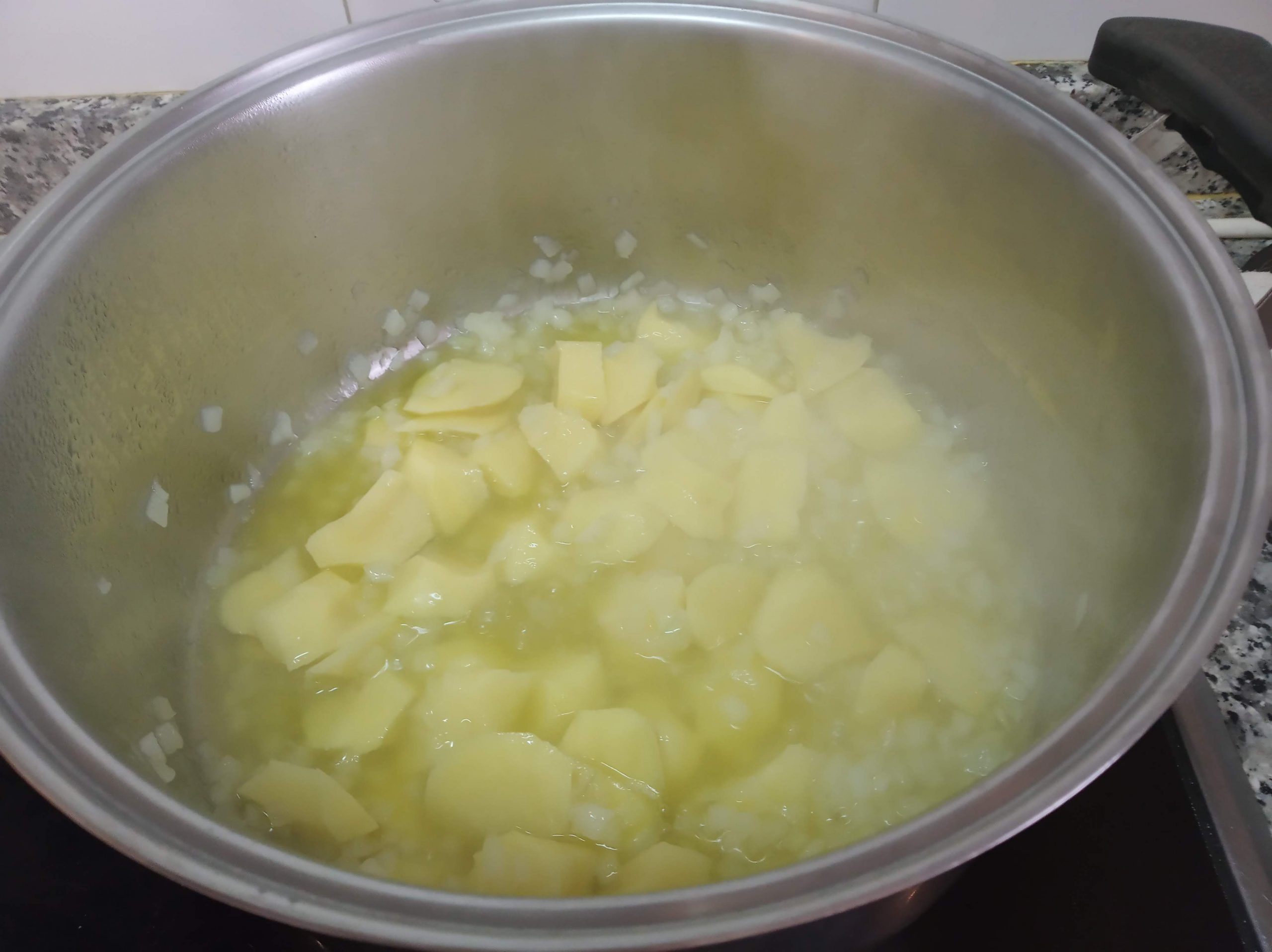 Pelamos las papas y troceamos a chasquido, añadiéndolas a las cebollas. Mezclar muy bien.