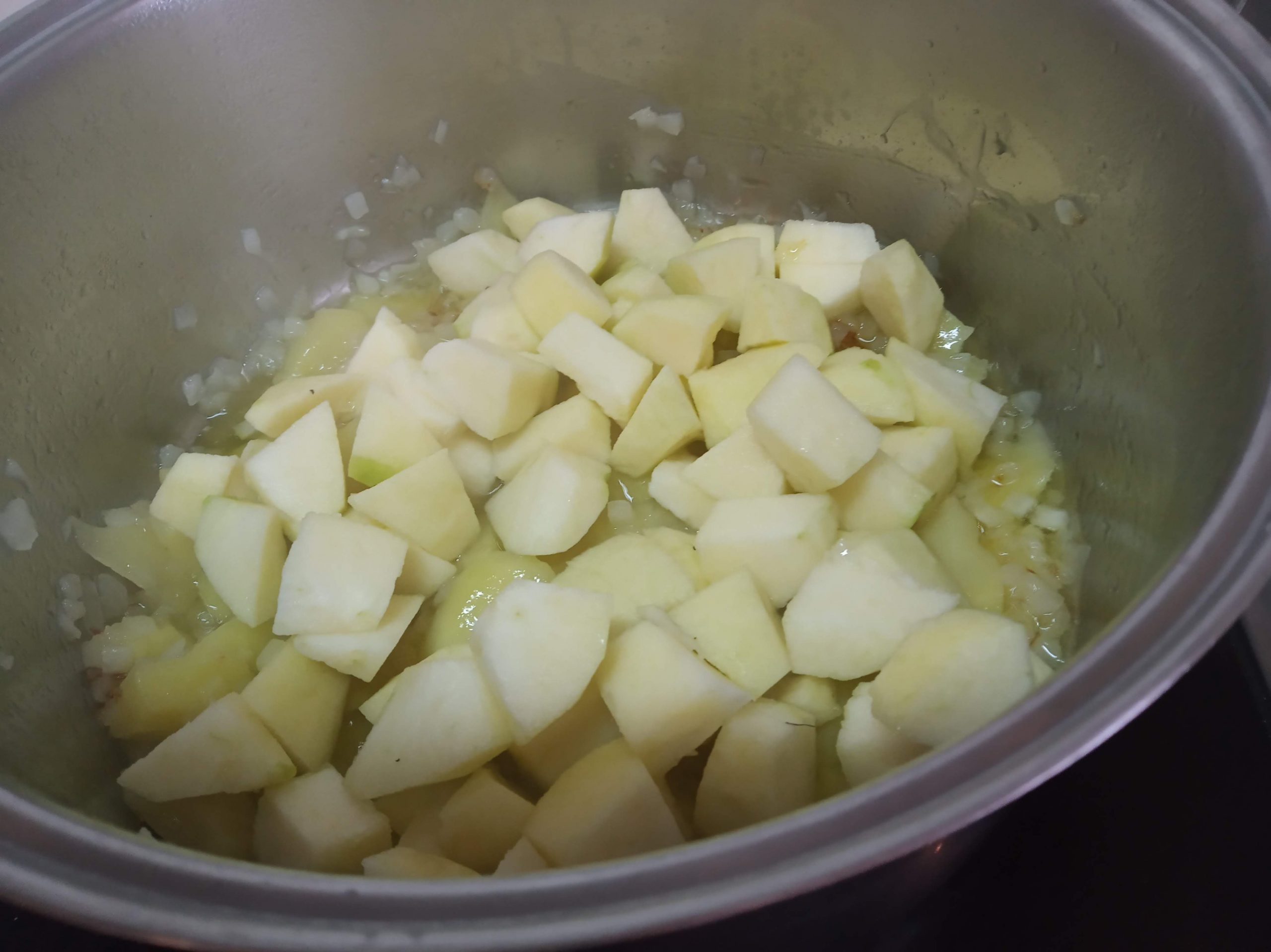 Pelamos y troceamos las manzanas y añadimos a la cacerola, volvemos a remover bien.