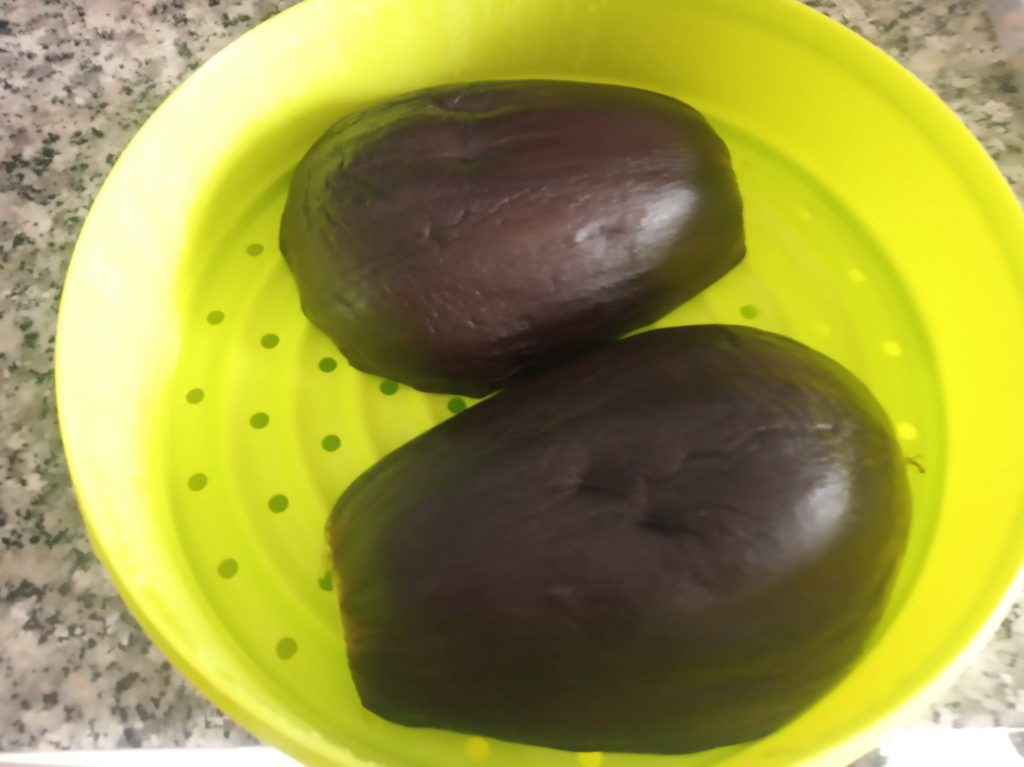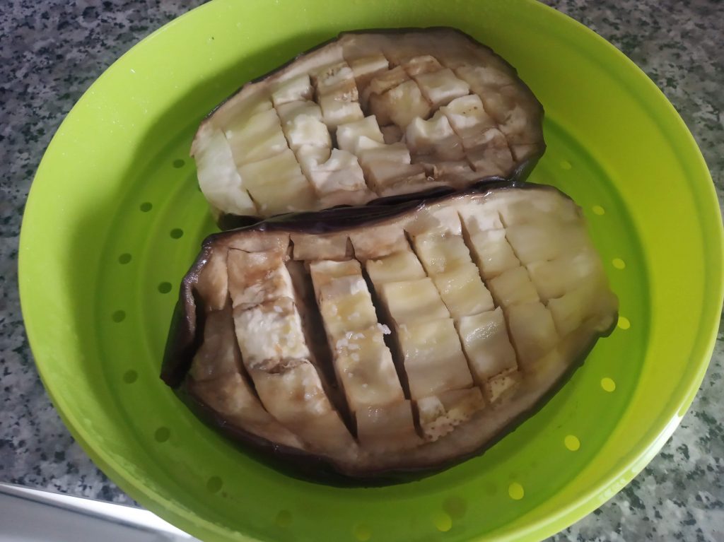 Cortar las berenjenas por la mitad, hacer rajitas, echar un poco de sal y aceite, y hacer con la piel para arriba al microondas 20 minutos tapadas, o hasta que se separe la carne de la piel.