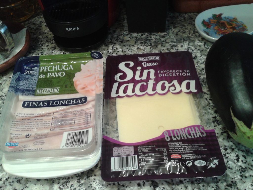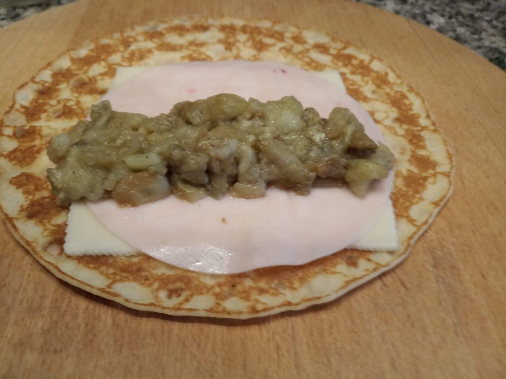 Rellena los crepes, con una loncha de pavo, otra de queso y de berenjena. Enrollarlos y colocar en una bandeja de horno con un poco de aceite por encima, si hace falta y están muy secos.