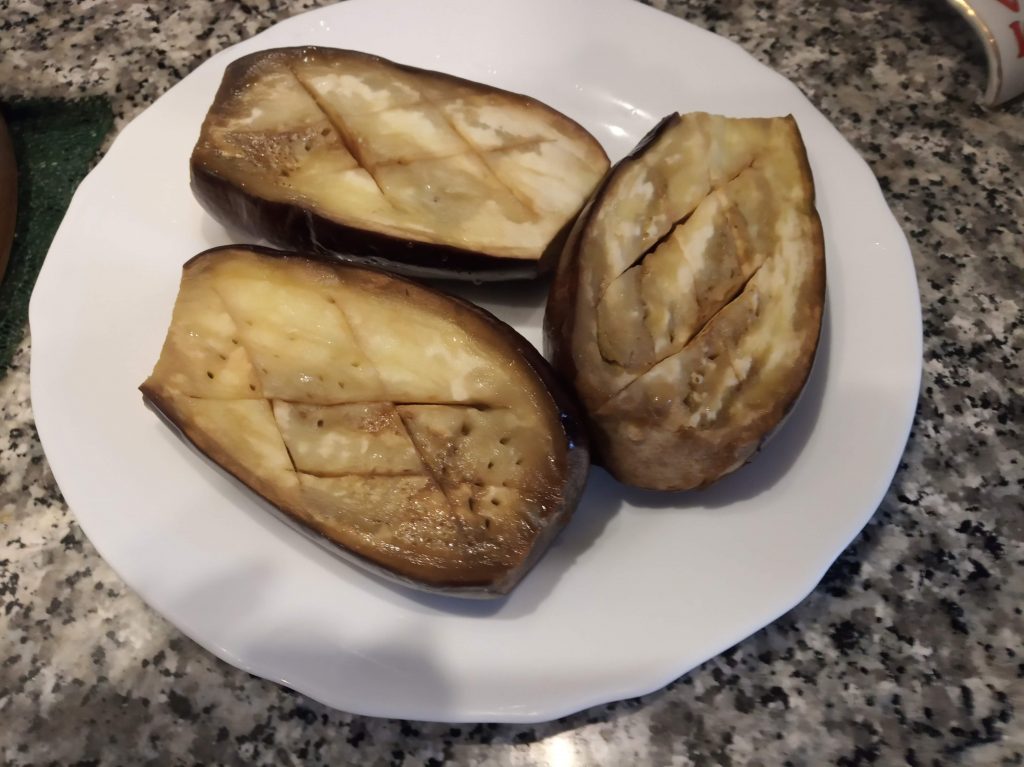 Cortar las berenjenas por la mitad , hacer rajitas, echar un poco de sal y aceite, y asar al horno 30′ tapadas con papel de aluminio o al microondas 15′ tapadas también, o hasta que se separe la carne de la piel.
