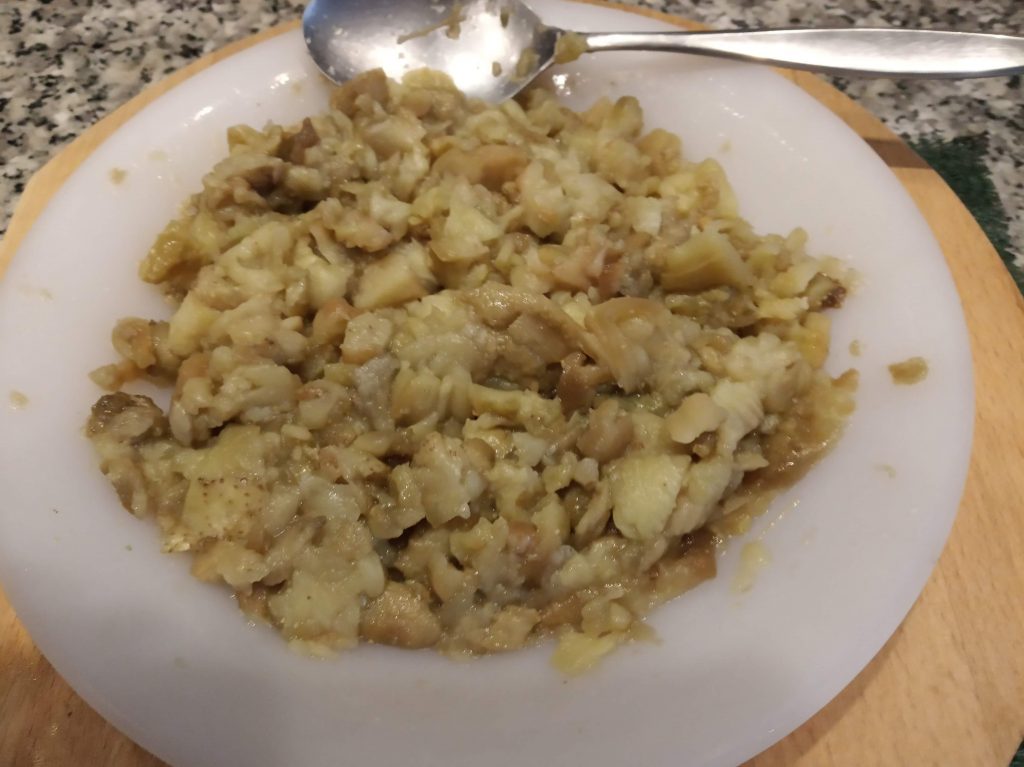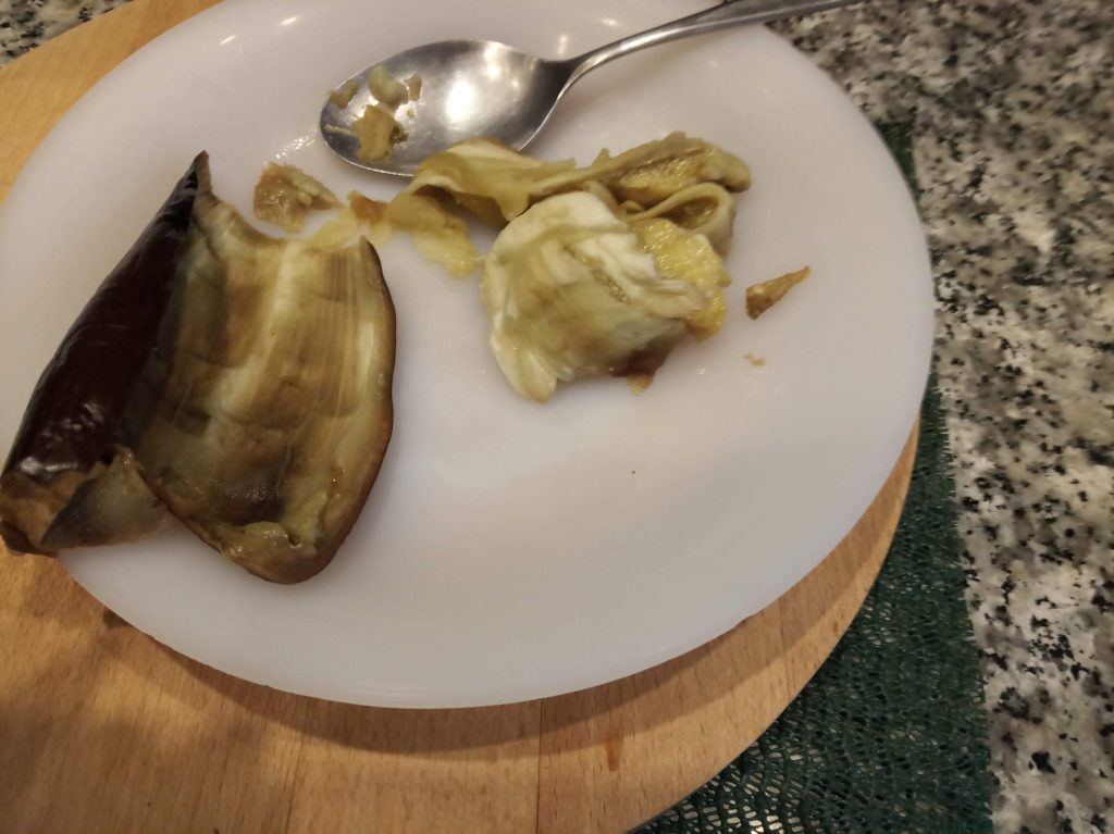 Dejar templar un poco, y con ayuda de una cuchara, sacar la carne de la berenjena, terminar de picar con el cuchillo o tijeras muy bien, rectificar de sal si es necesario. Reservar repartiendo luego en ocho porciones.