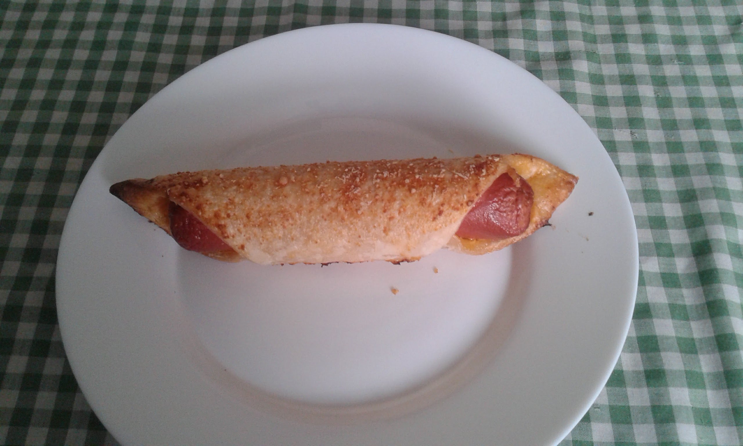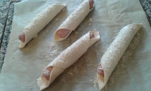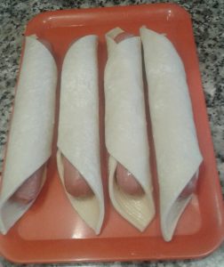 Poner la salchicha en la parte ancha y enrollar hasta el pico, quedando este para abajo.