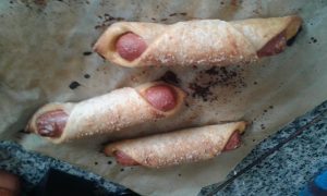 Colocar las salchichas en la bandeja de horno sobre el papel que trae la masa de hojaldre o uno nuevo.