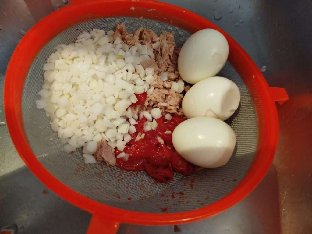 Echar en un escurridor, las latas de atún, los pimientos del piquillo y la cebolla picada.