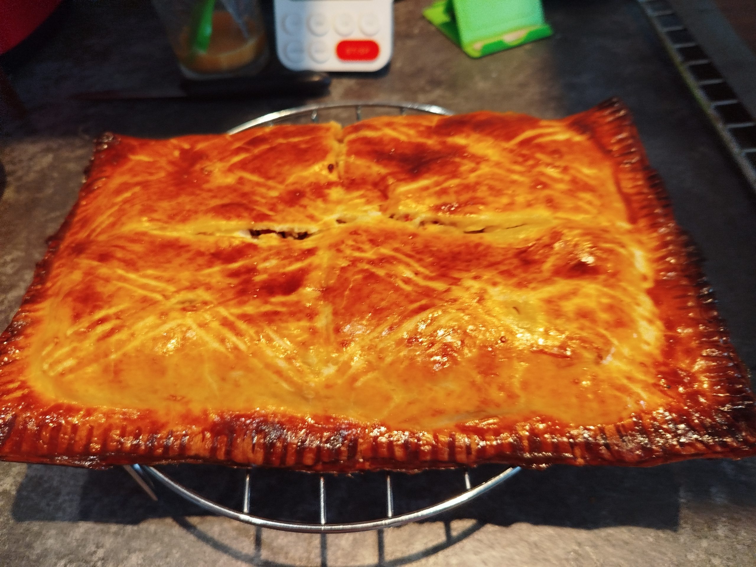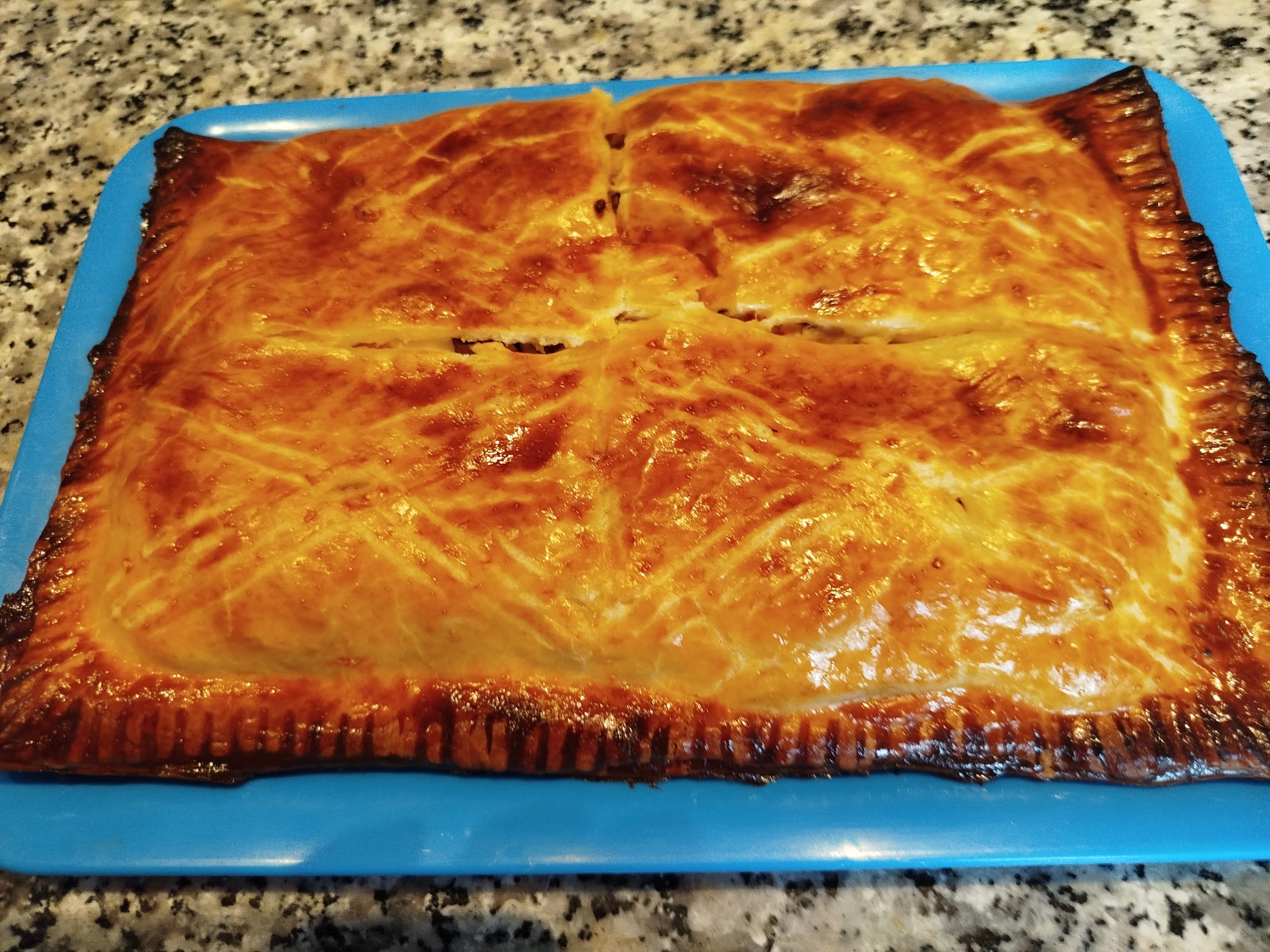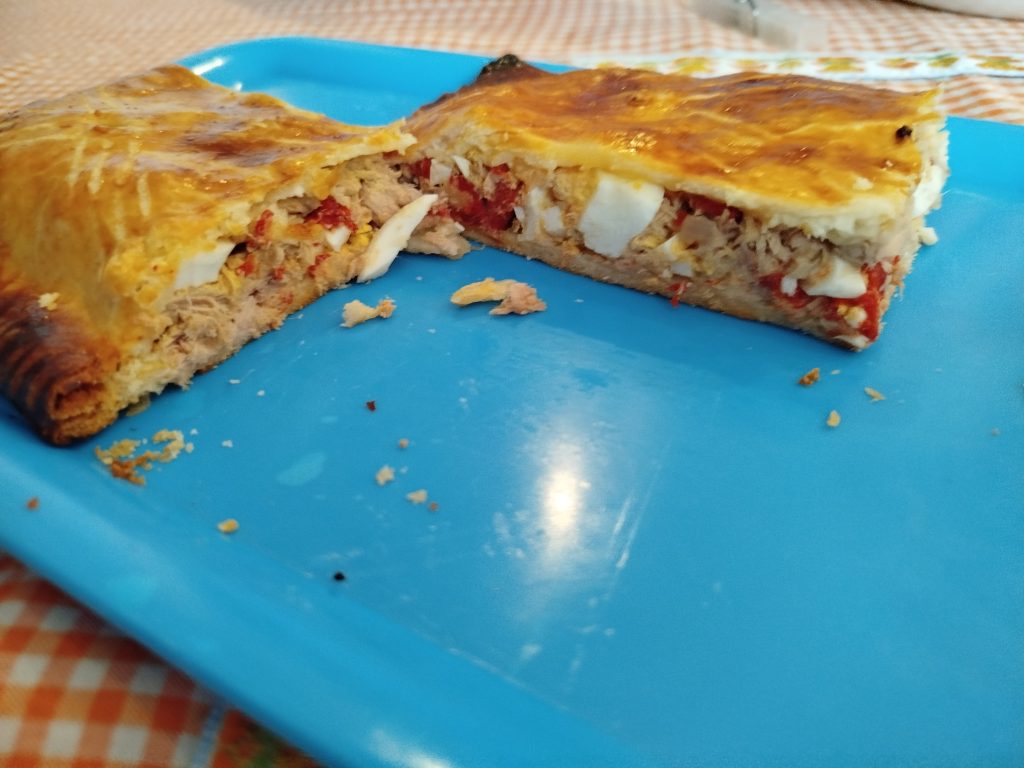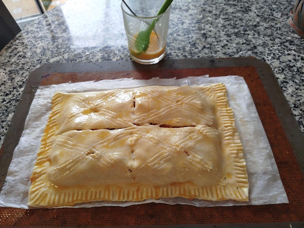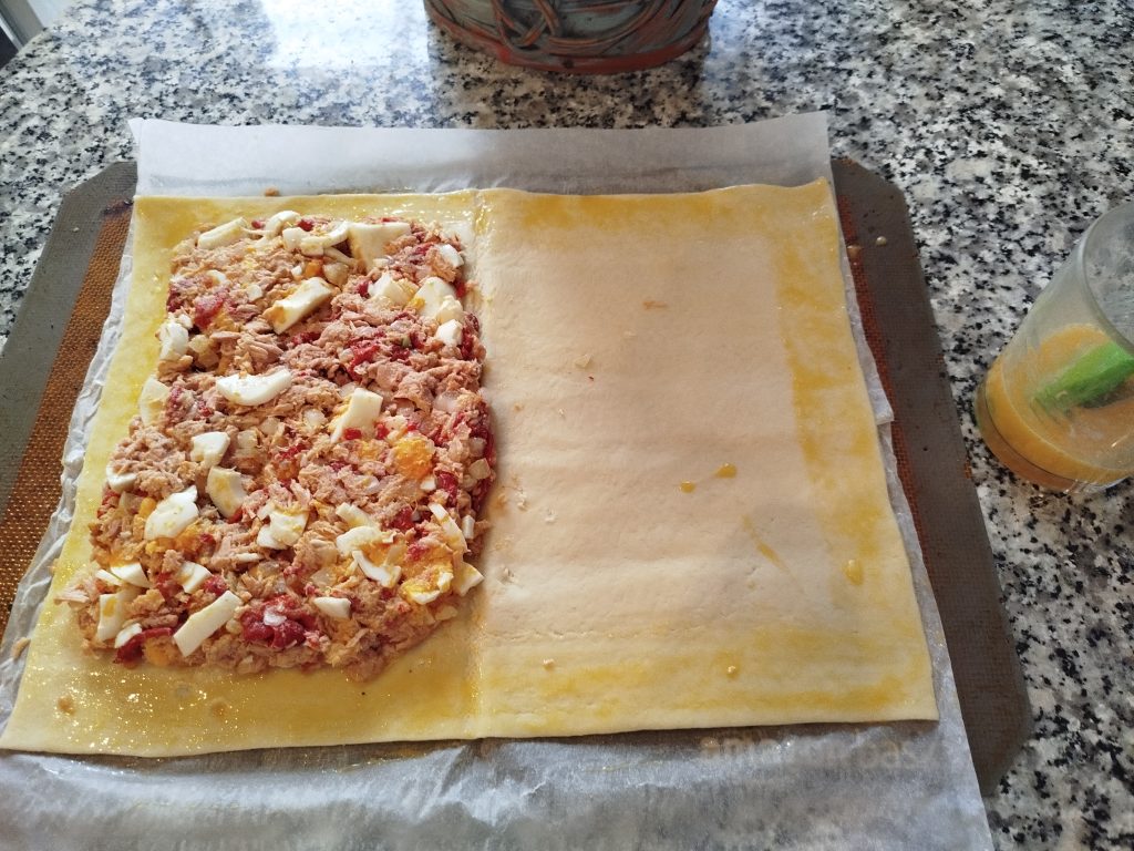 Batir el huevo y pintar los filos de la masa, doblar la masa y cerrar los filos con un tenedor, pintar por encima con el huevo batido, puedes marcar las cuatro raciones, hacerle un agujero a cada una en el centro, y decorar con el tenedor, a tu gusto.