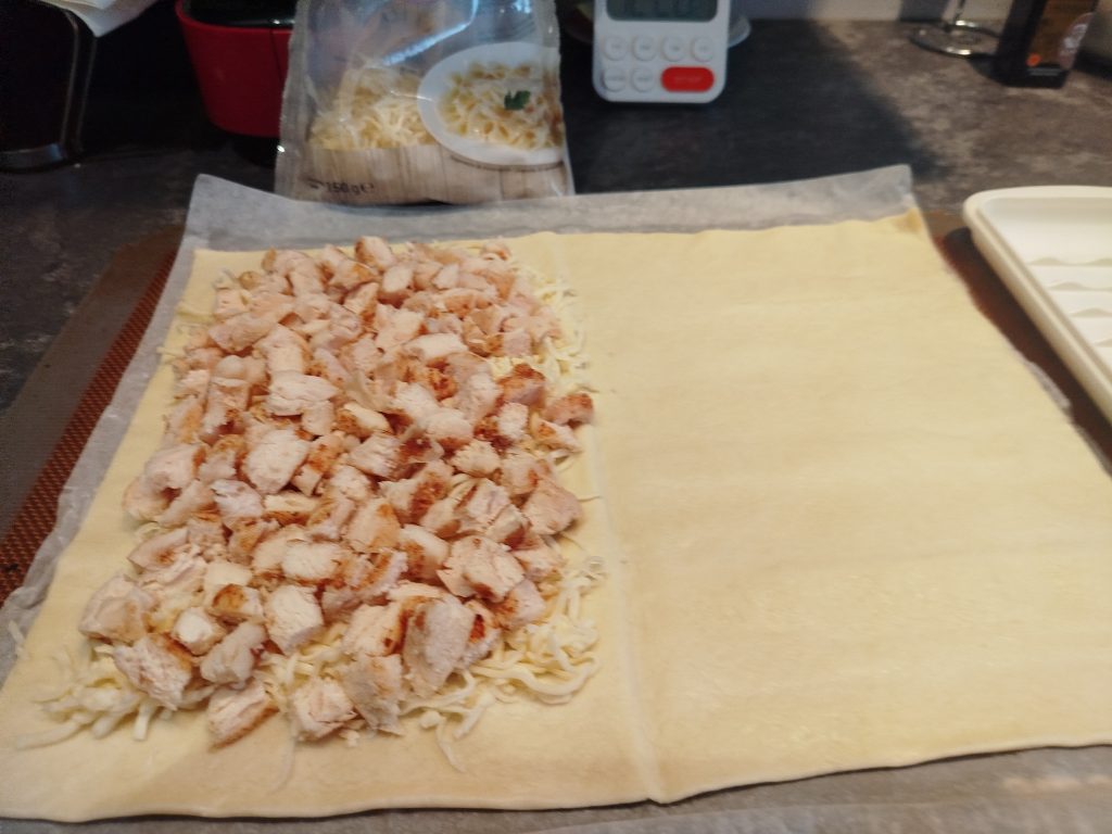 Echar en la mitad de la masa sin llegar a los filos, la MITAD del queso rallado, y por encima el pollo troceado.