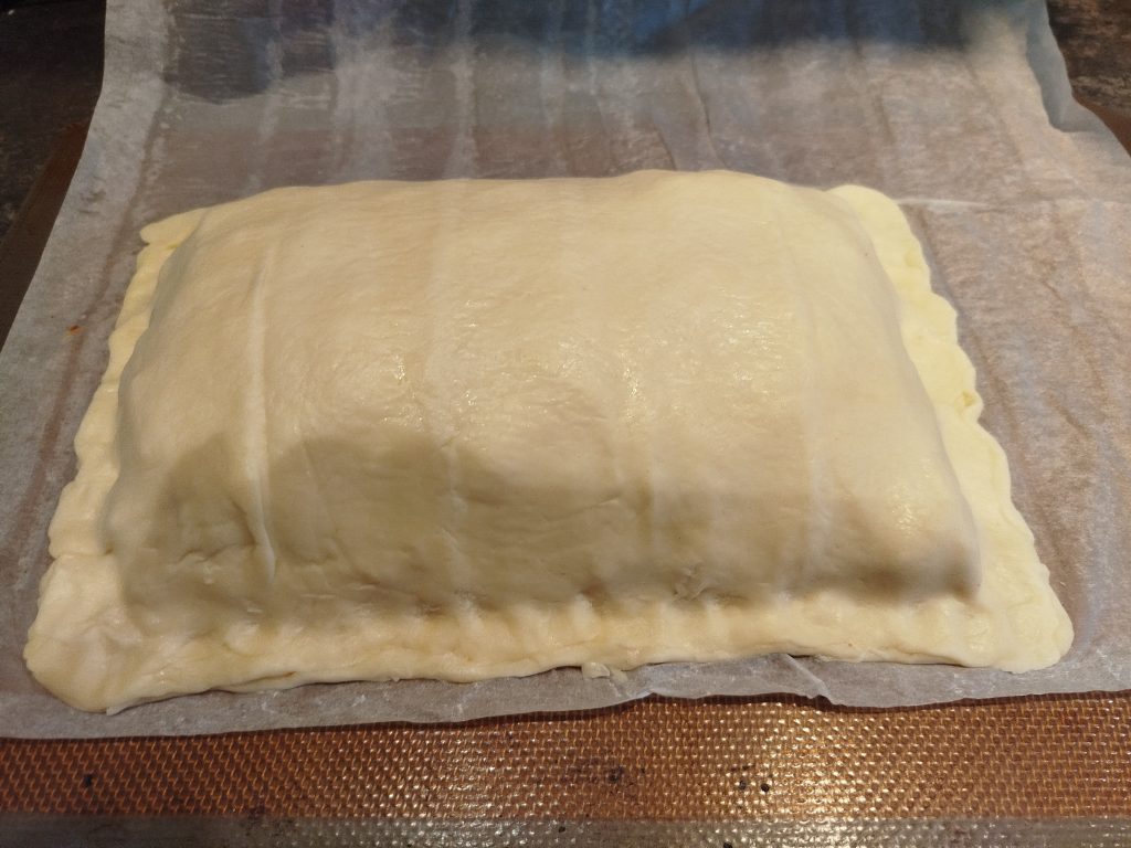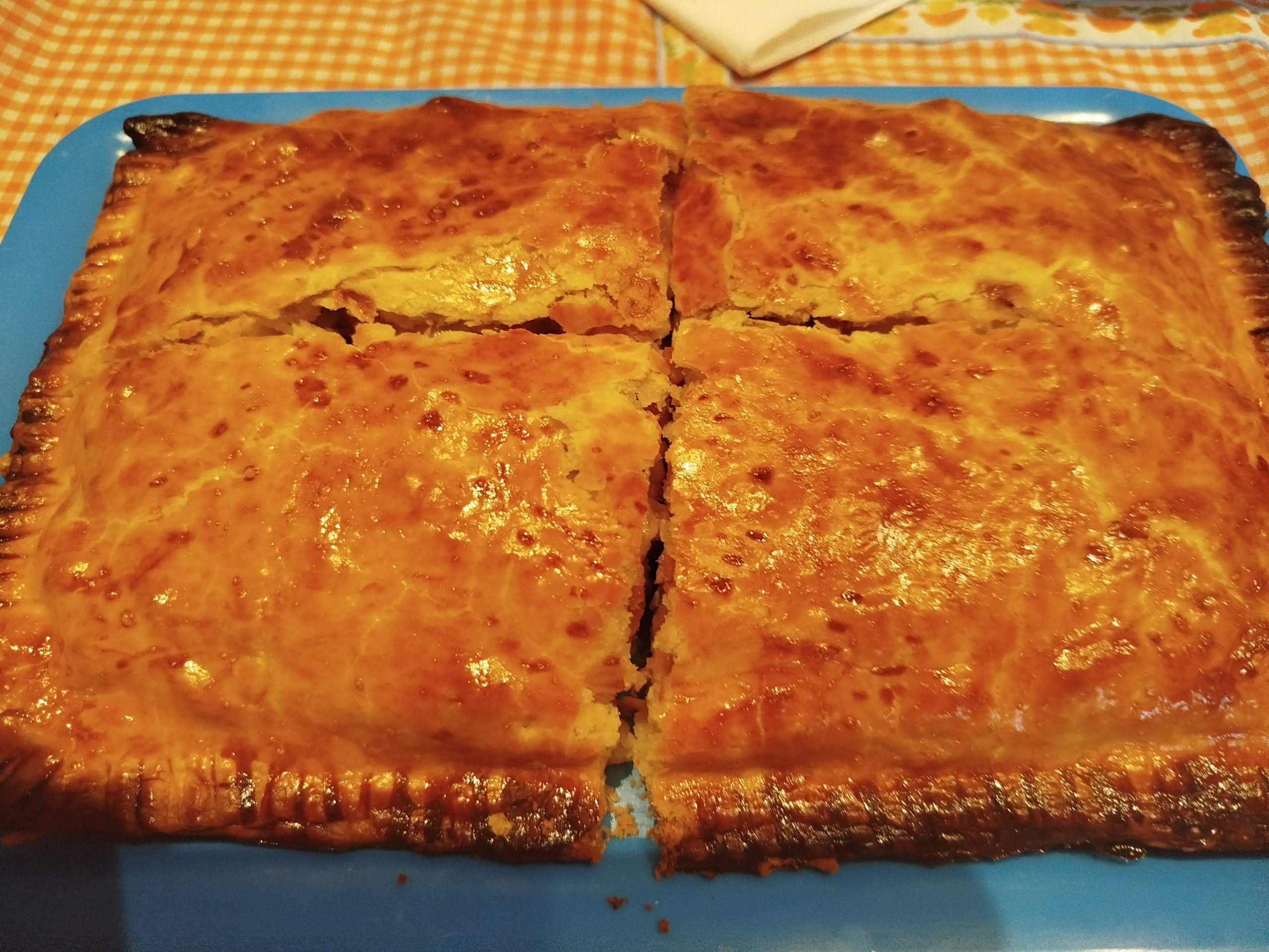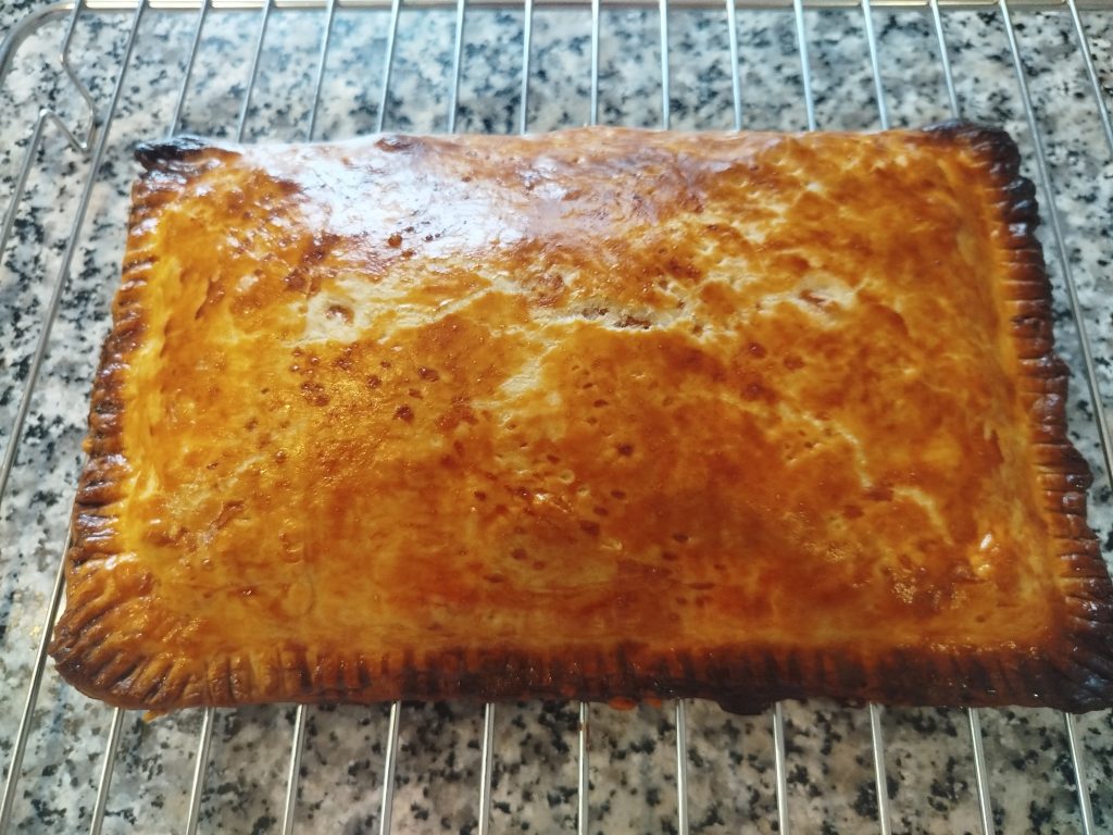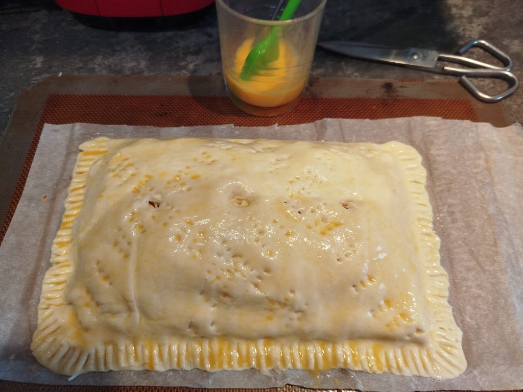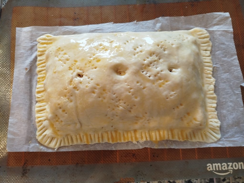 Cerrar la empanada con la otra mitad de la masa, presionar los filos primero con los dedos y luego con un tenedor, o hacer pliegues. Pintar con huevo batido, y hacer algún dibujo en el tenedor, pinchando la masa y hacer tres orificios para que respire la masa.