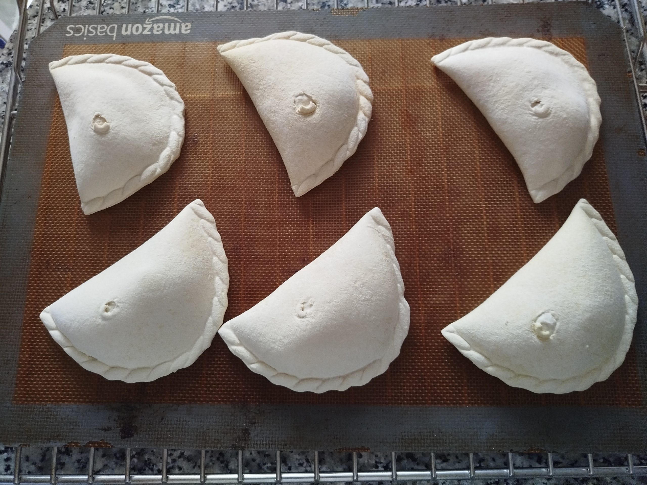 Colocar las empanadas sobre un tapete de silicona o papel de hornear, y meter al horno en la parte central, y hacer a 200 grados durante unos 25 minutos, vigilar cada horno es diferente.