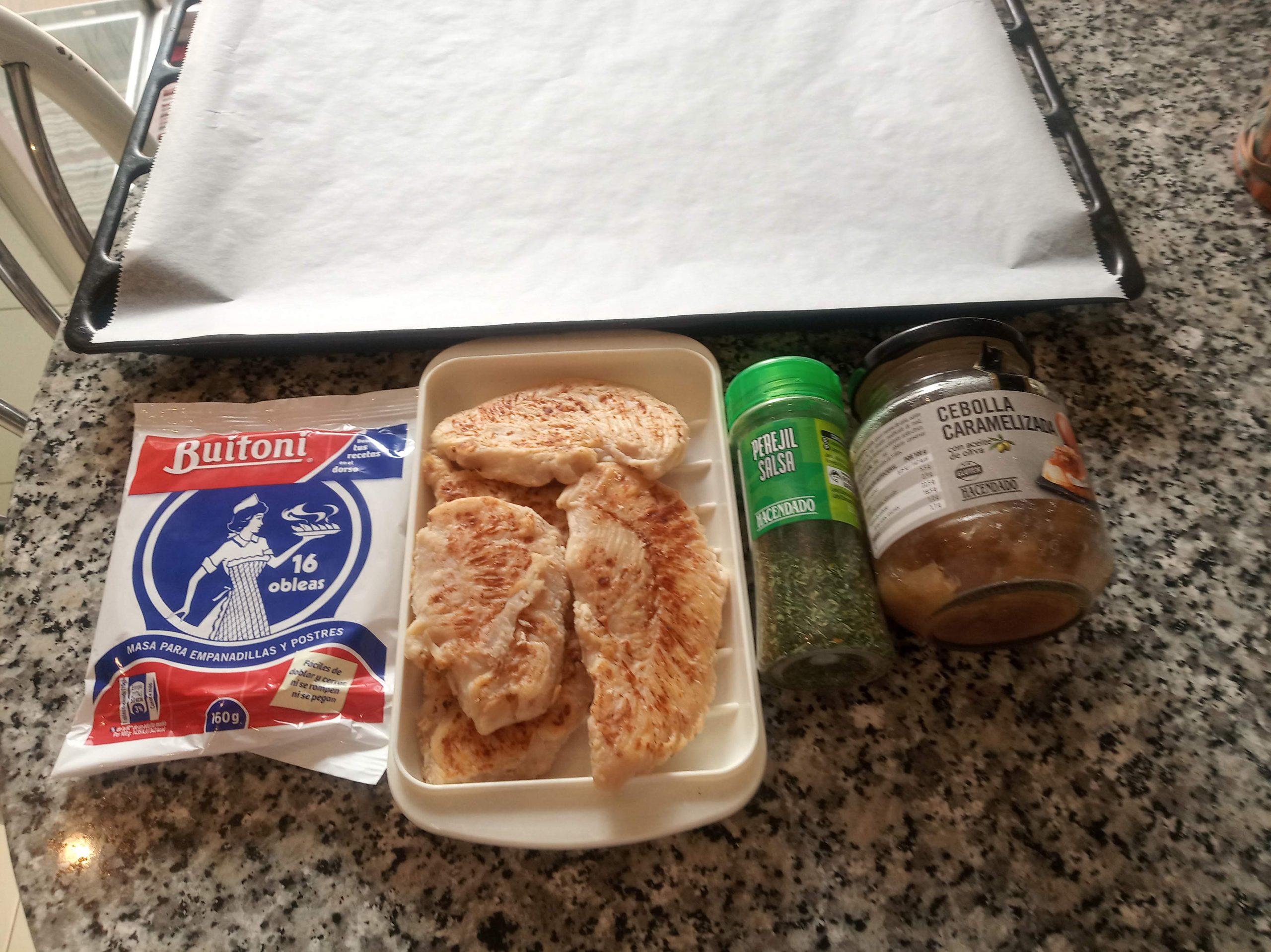 Receta tomada de otra receta mía con masa Filo. Briwat de pollo y cebolla caramelizada Exprés