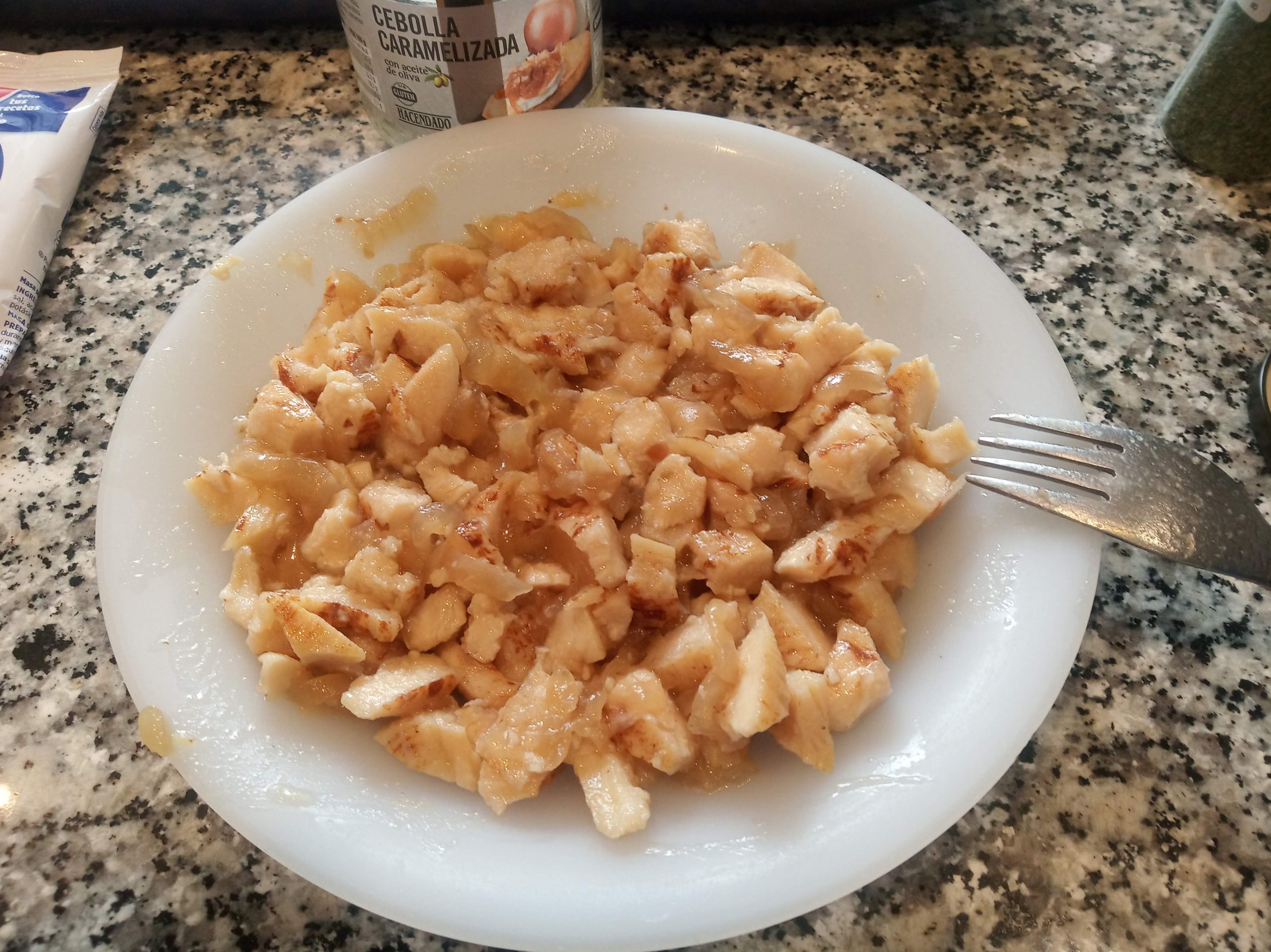 En un cuenco, cortamos los filetitos en tiras y luego en trocitos pequeños, le añadimos la ½ del bote de cebolla carameliza, y mezclamos muy bien todo. El resto del bote lo puedes congelar para otro día.