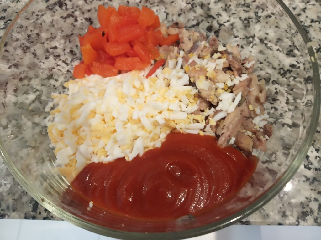 Los huevos cocidos rallados, el tomate frito y mezclar todo muy bien.