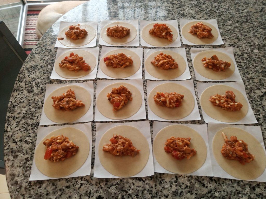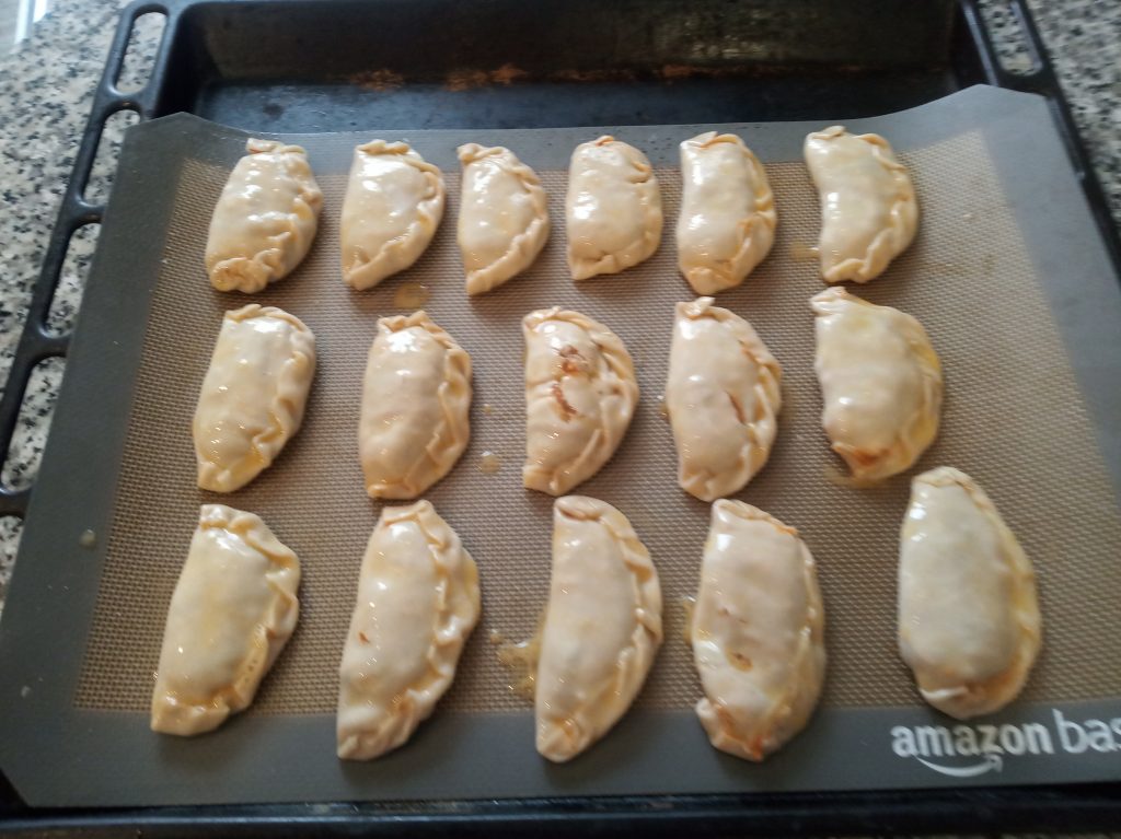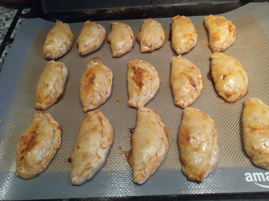 Cogemos una oblea con su papel debajo, echamos en medio una cucharada del preparado, y doblamos por la mitad. Para repartirlo bien, puedes poner todas las obleas con su papel en la mesa, y repartimos el relleno, y cerramos las empanadillas y las colocamos en la bandeja de horno, con tapete de silicona o de horno.