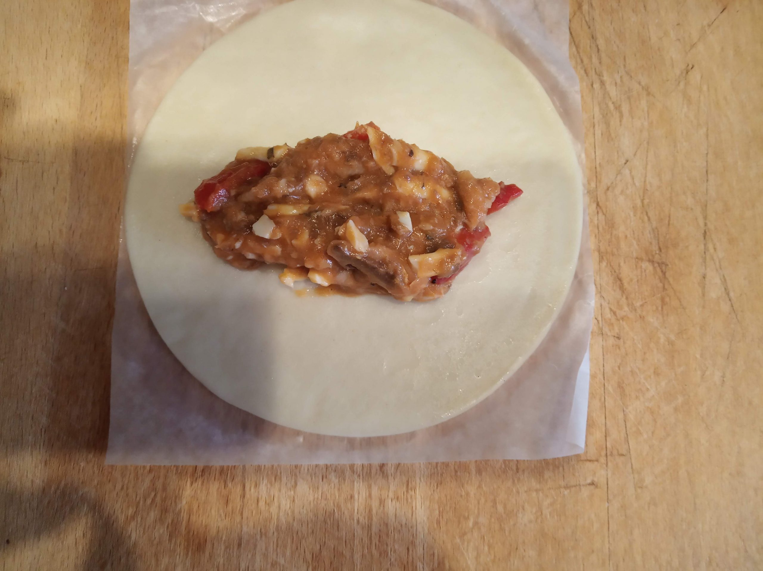 Cogemos una oblea con su papel debajo, echamos en medio una cucharada del preparado, y doblamos por la mitad. Para repartirlo bien, puedes poner todas las obleas con su papel en la mesa, y repartimos el relleno, y cerramos las empanadillas y las colocamos en la bandeja de horno, con tapete de silicona o de horno.