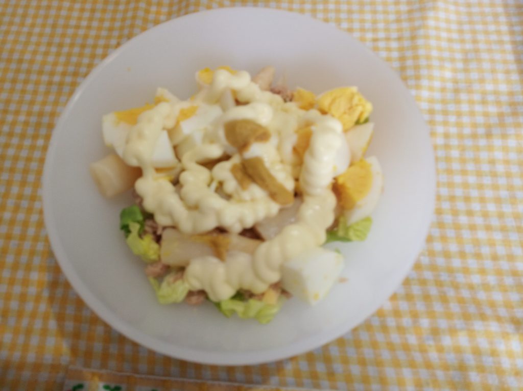 En un cuenco, táper o plato, poner en el fondo, la lechuga troceada en tiras finas y el atún desmenuzado.