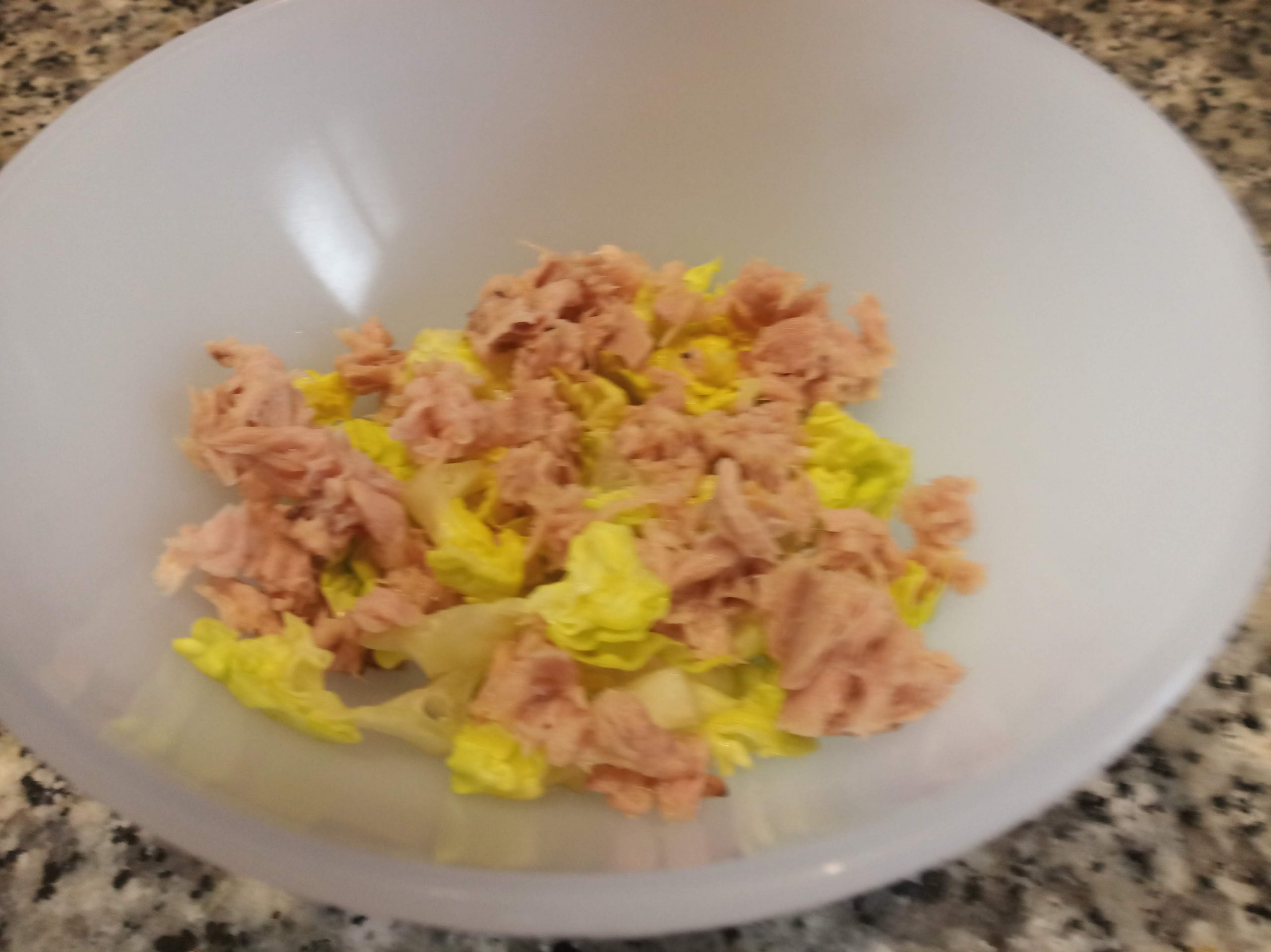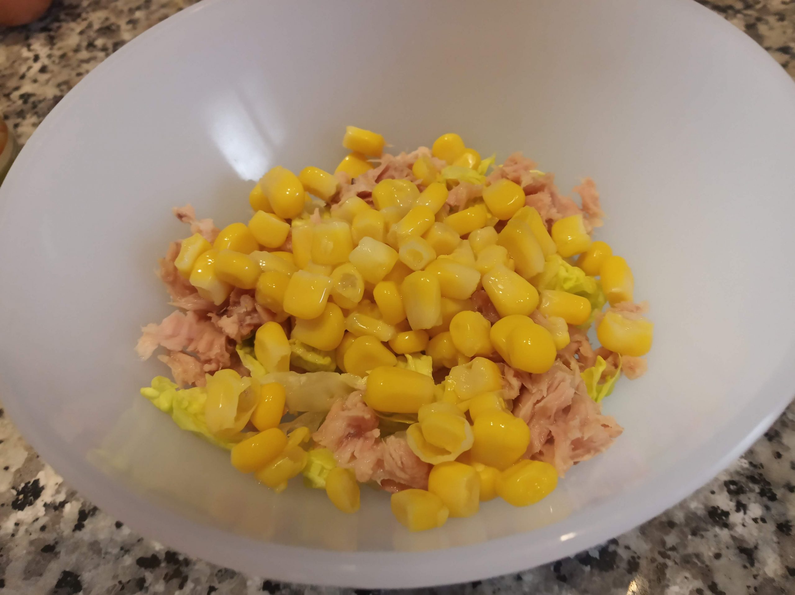 En un cuenco, táper o plato, poner en el fondo, la lechuga troceada en tiras finas y el atún desmenuzado.
