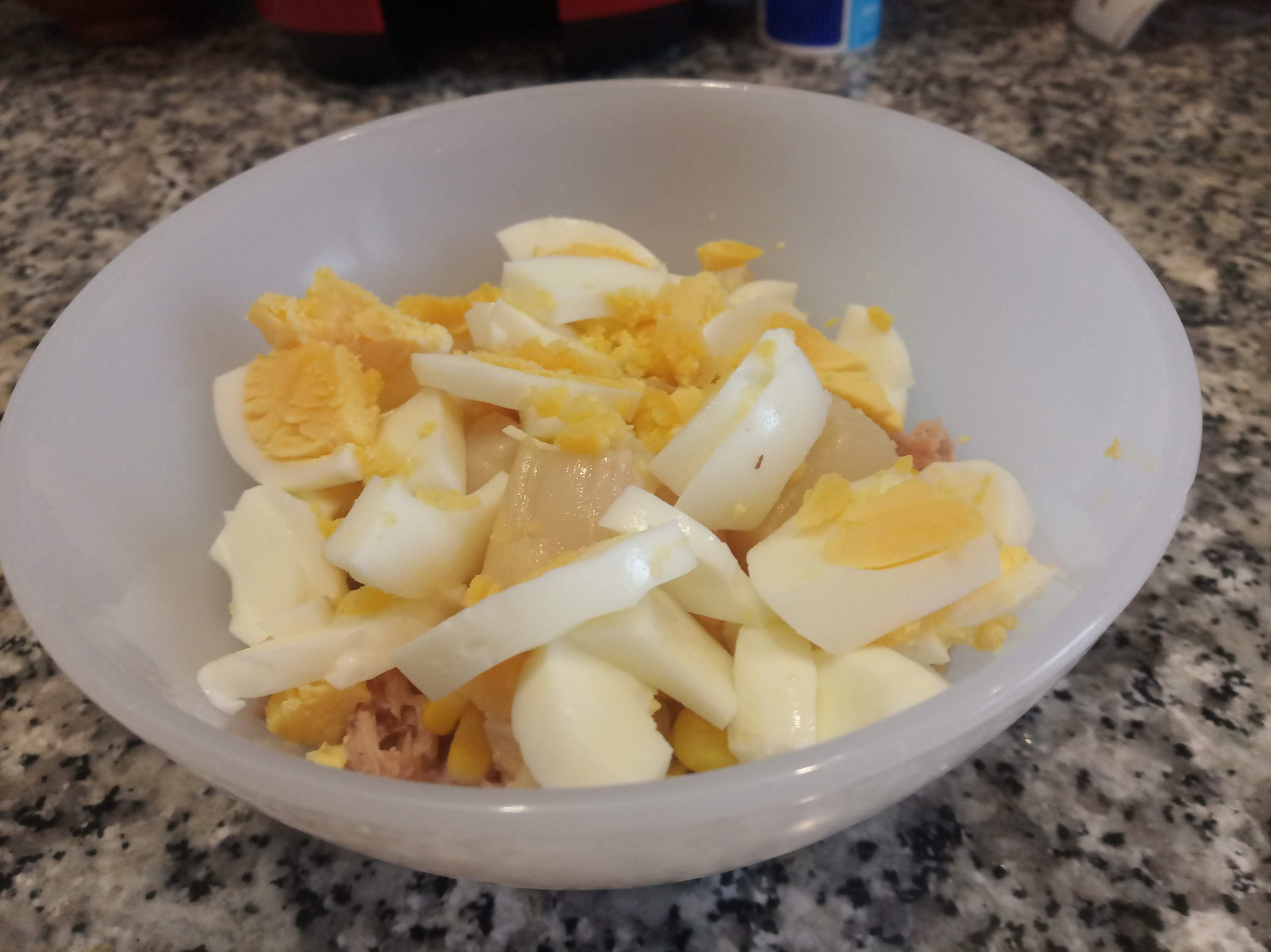 Después repartir el maíz, las yemas troceada en dos o tres trozos y un huevo picado por persona.