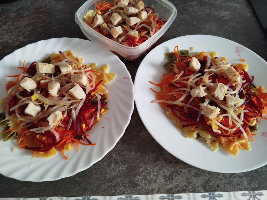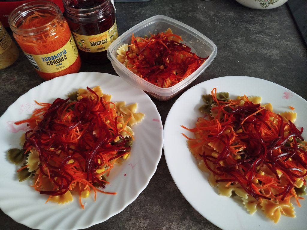 Repartir la pasta en tres platos llanos, o dos platos y un táper en mi caso.