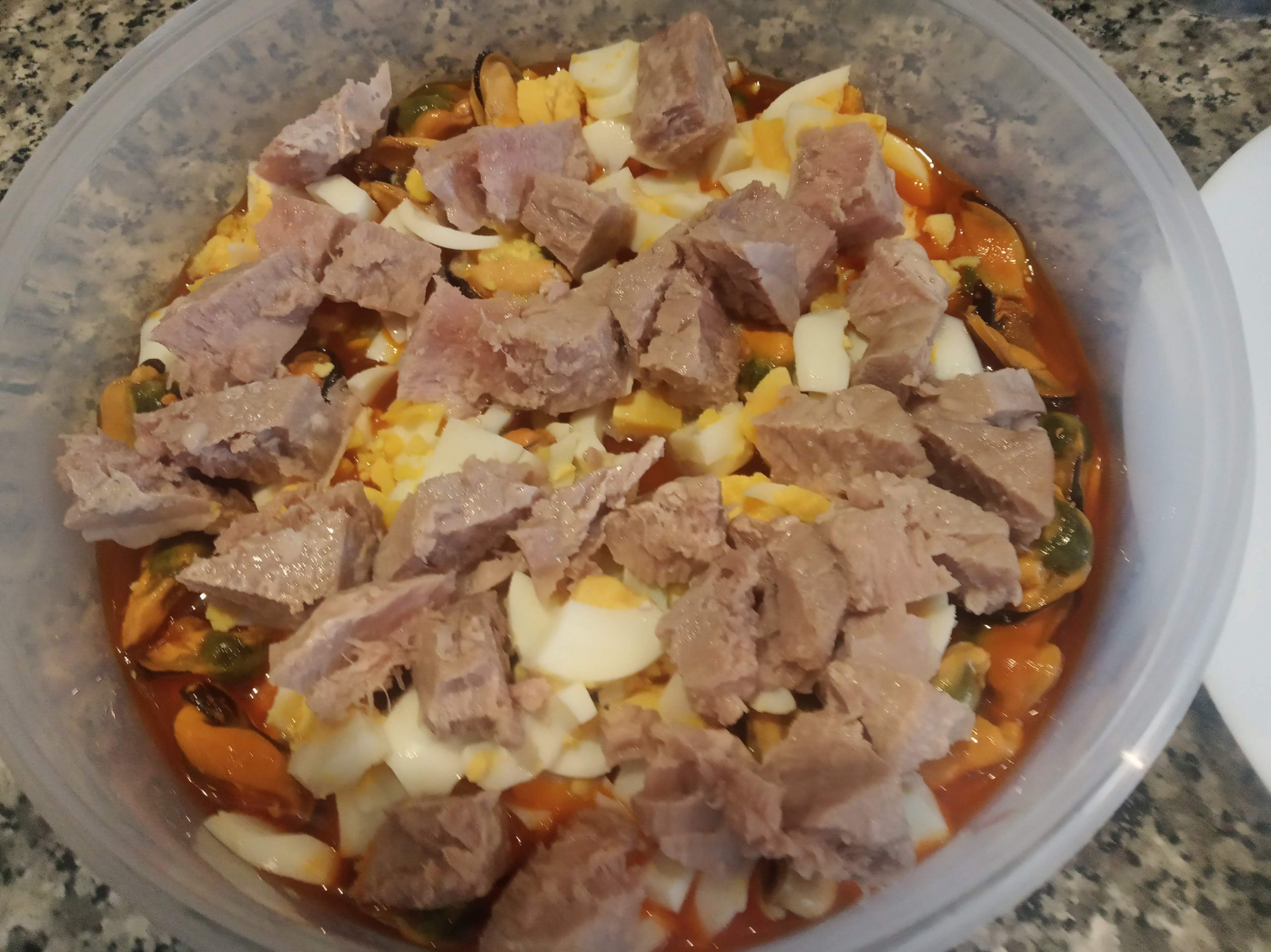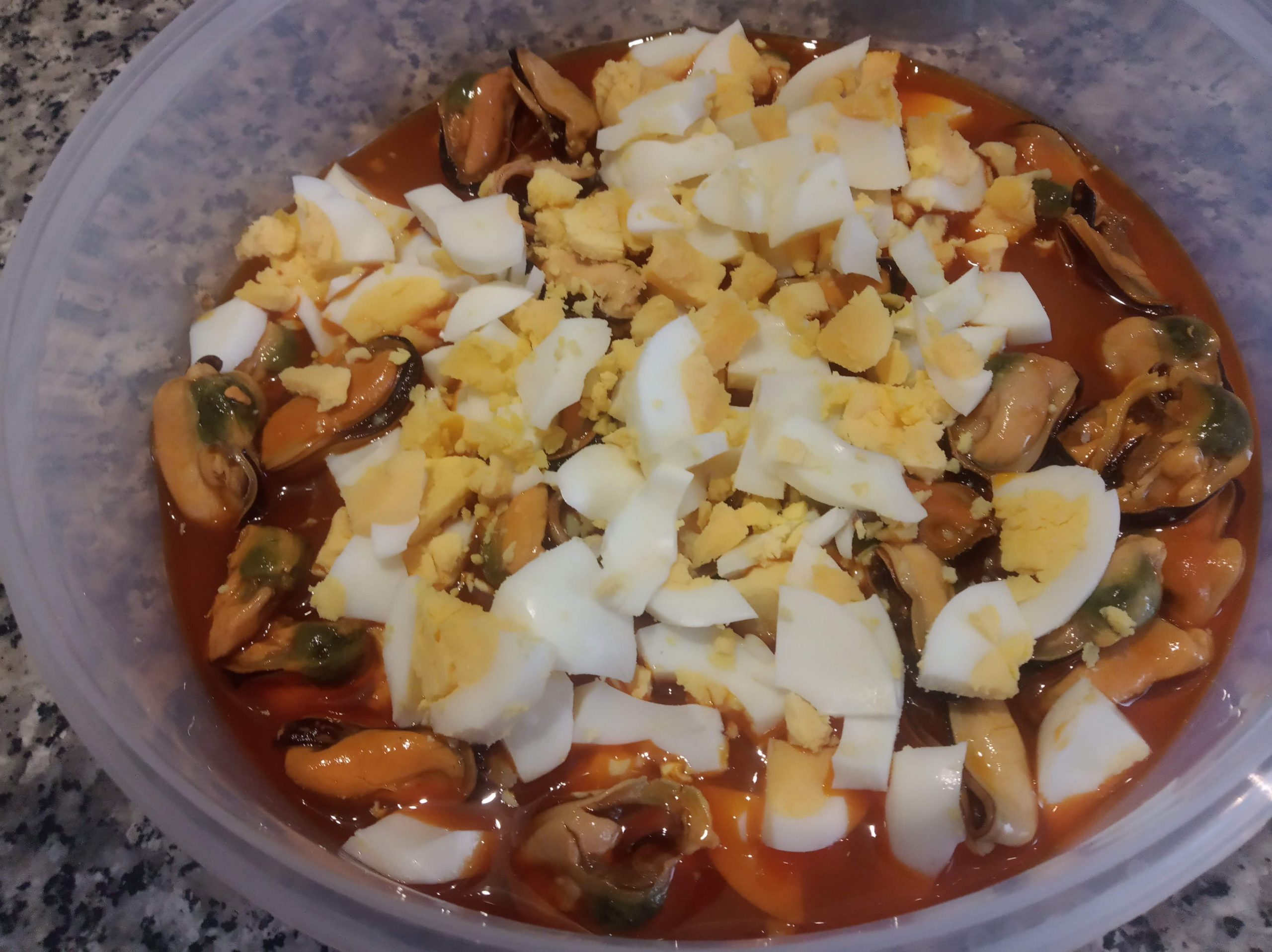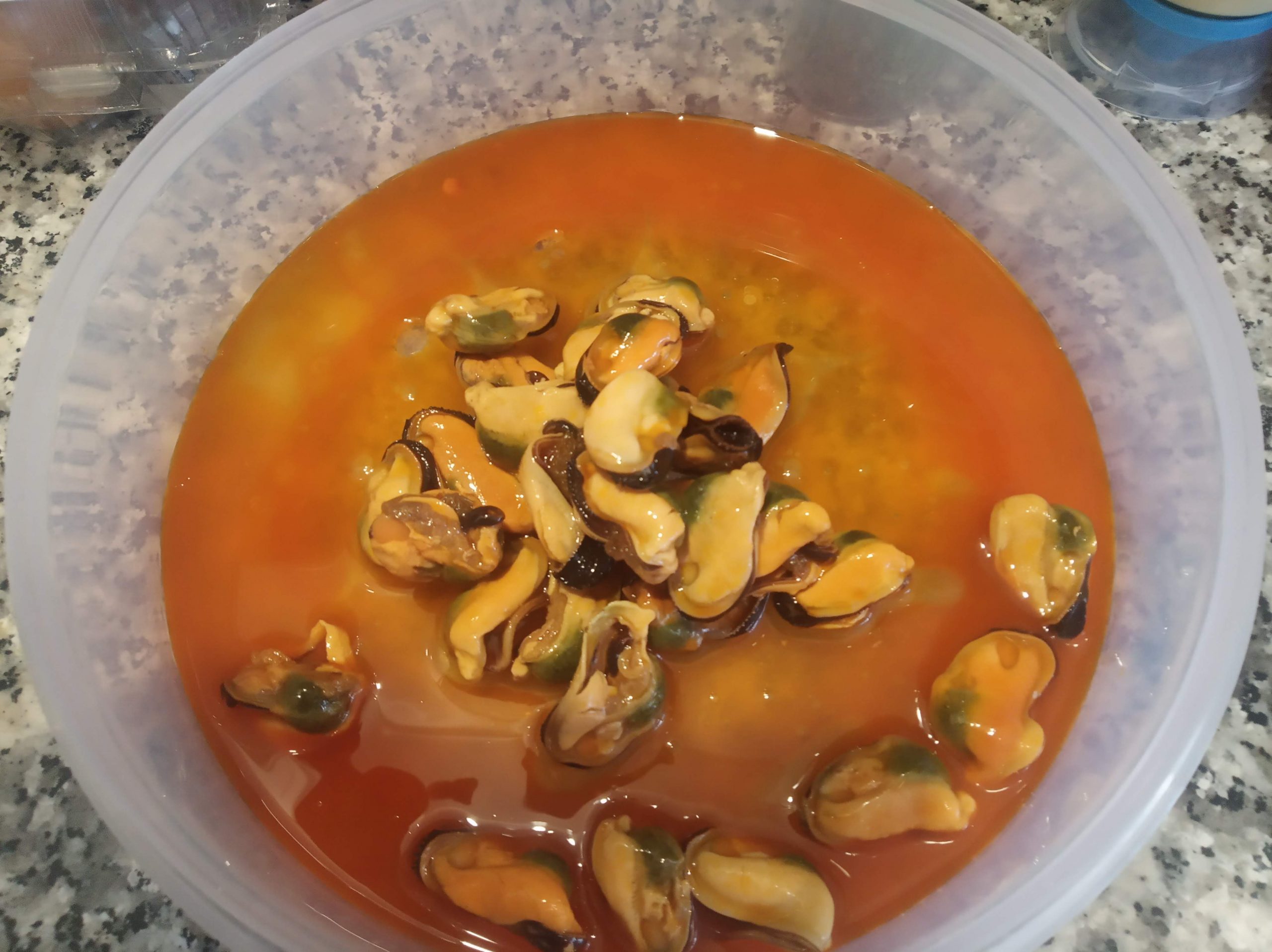 En un táper echamos las latas de mejillones con su jugo.