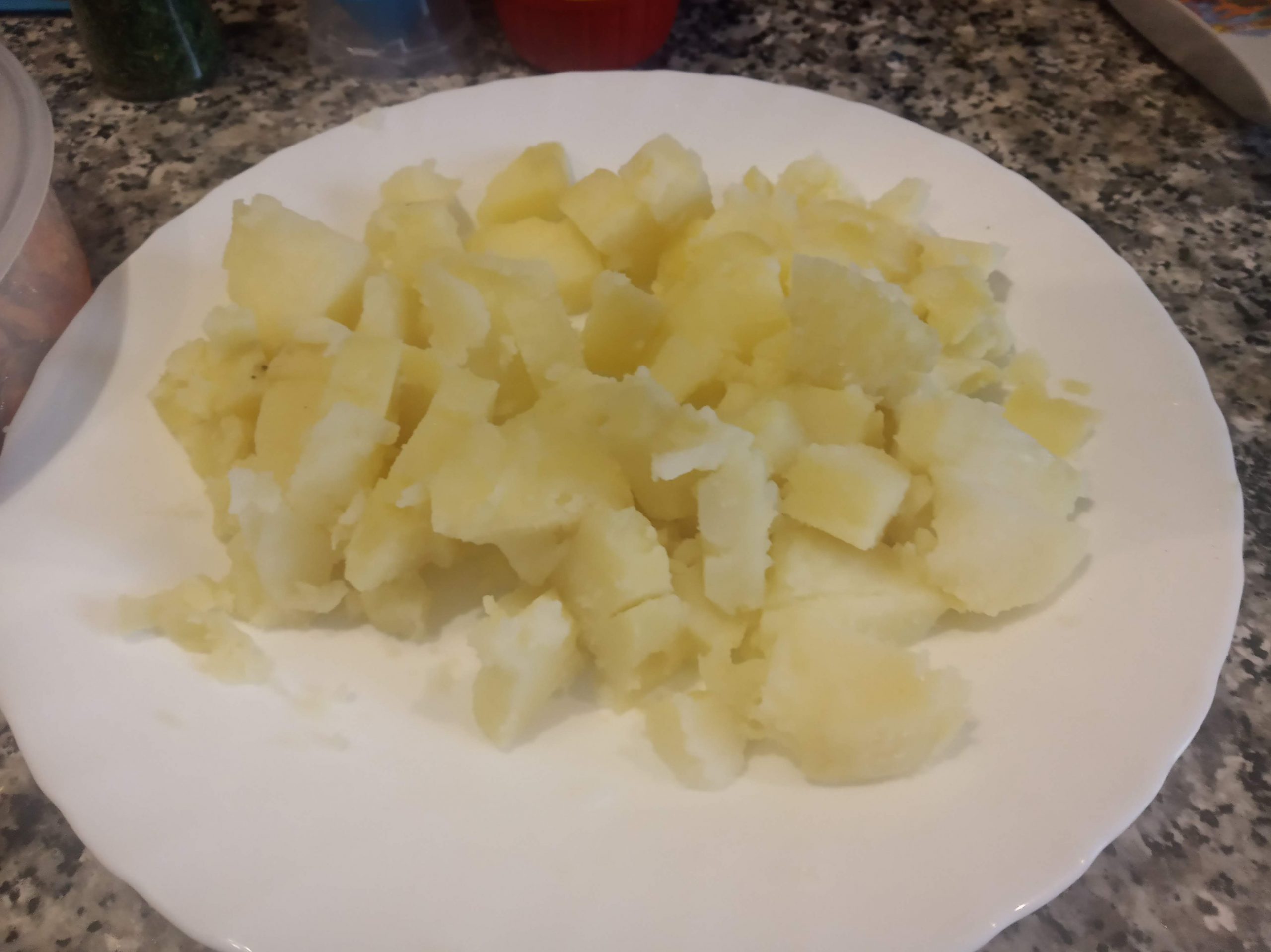 Pelamos y troceamos las patatas y se las añadimos también.