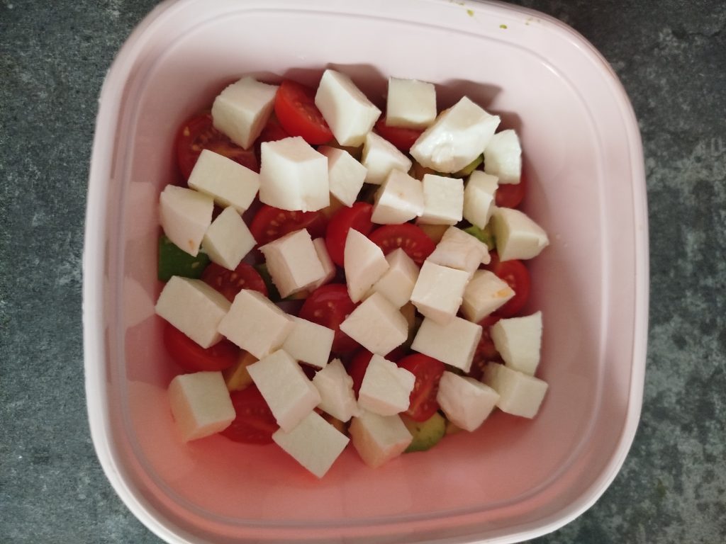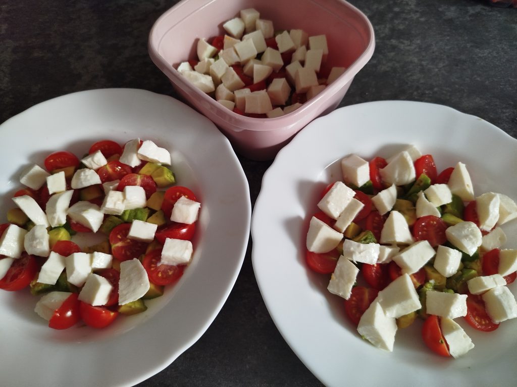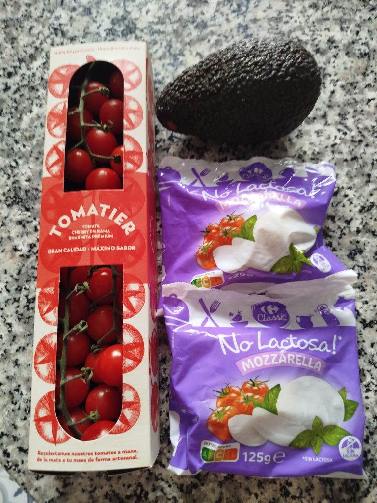 Por ultimo, troceo en rodajas gordas, la mozzarella en mi cazo sin lactosa, luego en tiras y posteriormente en dados, también puedes comprar, Perlas de mozzarella, pero no las hay sin lactosa, repartir encima de los tomates cherry.