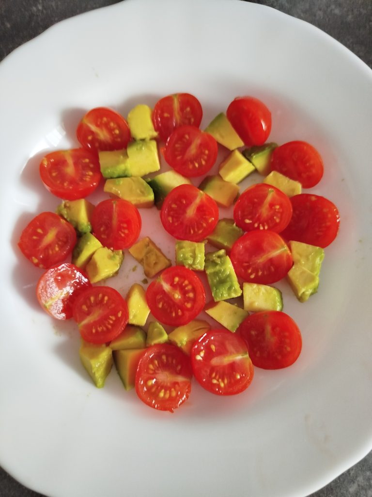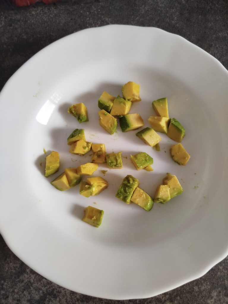 Comienzo preparando el aguacate, troceándolo y dividiendo en tres partes, lo reparto en plato hondo, cuenco o táper, si es para llevar