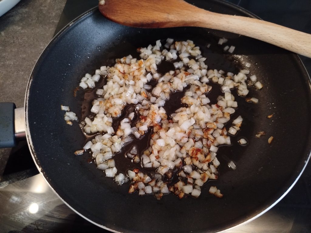 En una sarten echamos un poco de aceite y la cebolla troceada con un poco de sal, sofreír y apagar la candela.