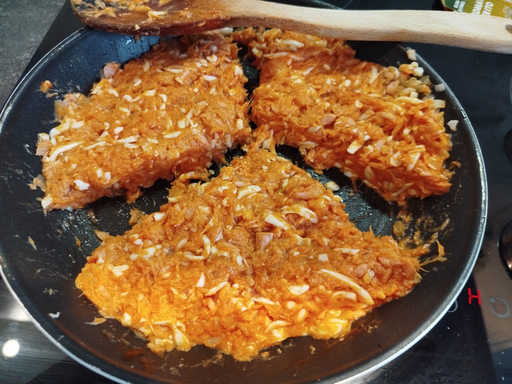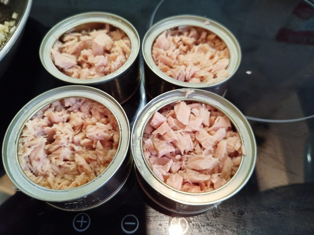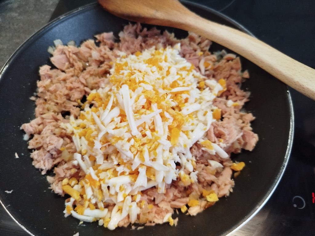 Le añadimos el atún desmenuzado y escurrido, los huevos cocidos rallados, el tomate frito y lo mezclamos todo muy bien.