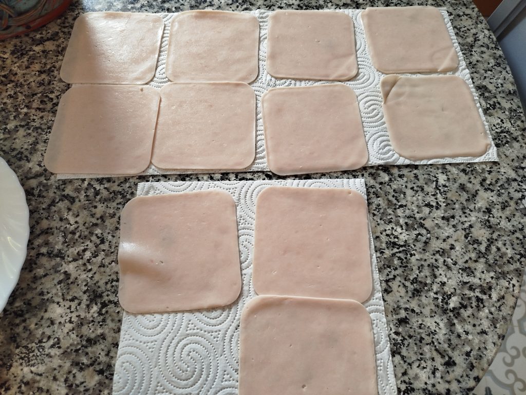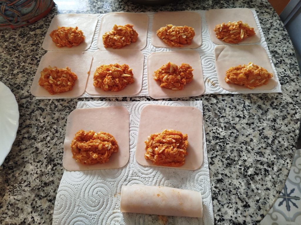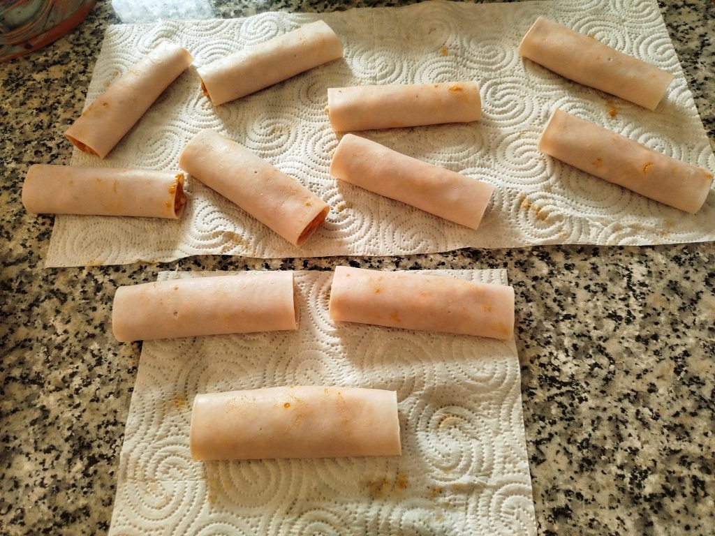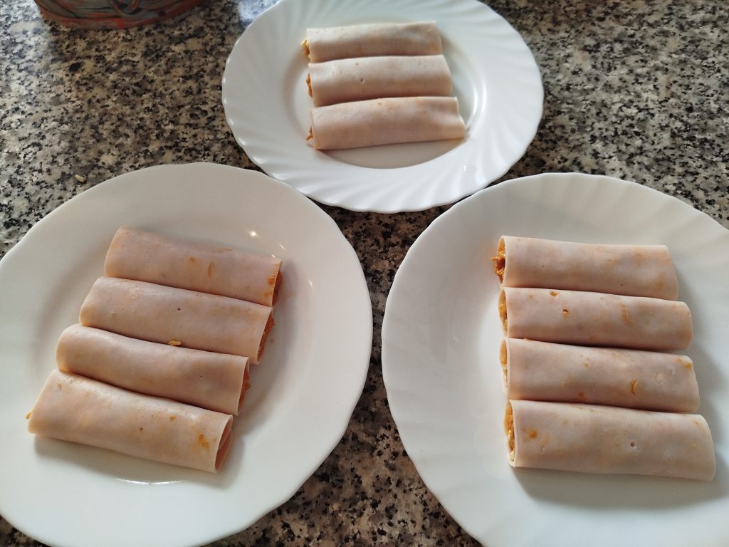 Repartir 4 rollitos, en cada plato, menos en uno que puse solo tres, al faltar una loncha.