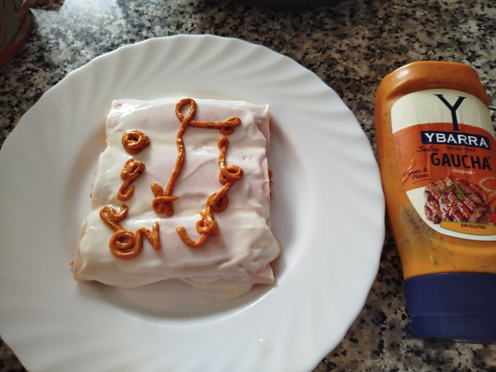 Al mío, no le puse el queso, y le eche un poco de salsa Gaucha, para mi gusto, prefiero otra, ésta pica un poco, y no soy de picante.